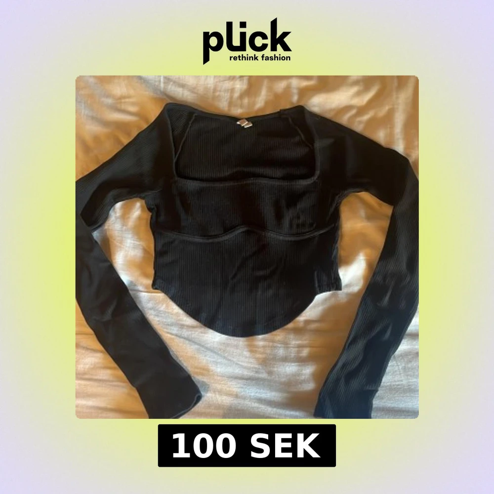 Säljer en svart ribbad långärmad topp från Nelly med fyrkantig urringning och markerad söm under bysten. Toppen är croppad och har en tight passform.