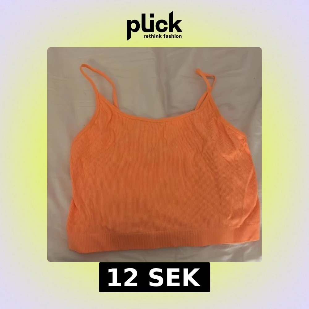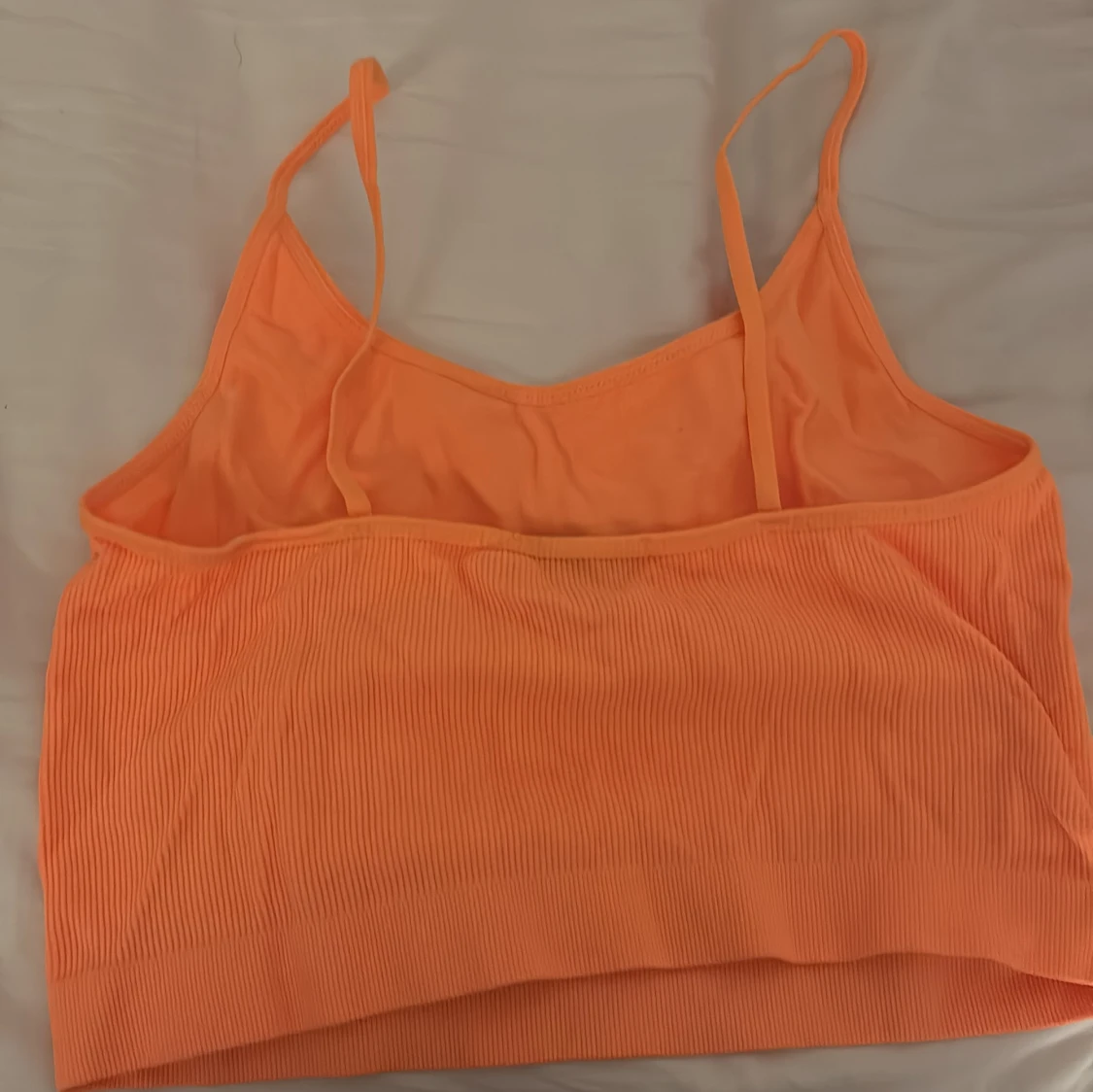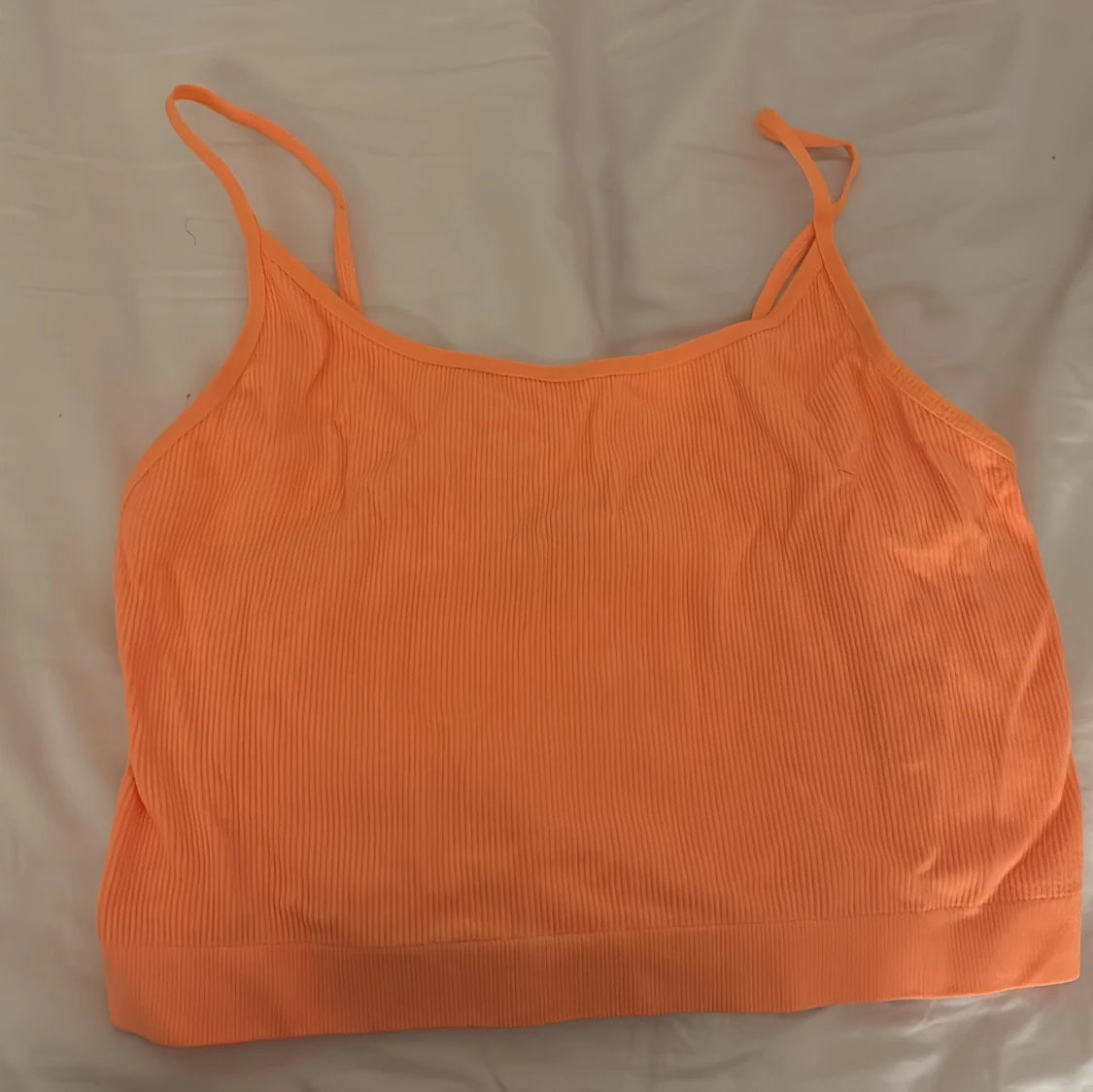 Säljer en ribbad orange linnetopp med smala axelband. Toppen är croppad och har en enkel, kan användas ute eller till gymmet