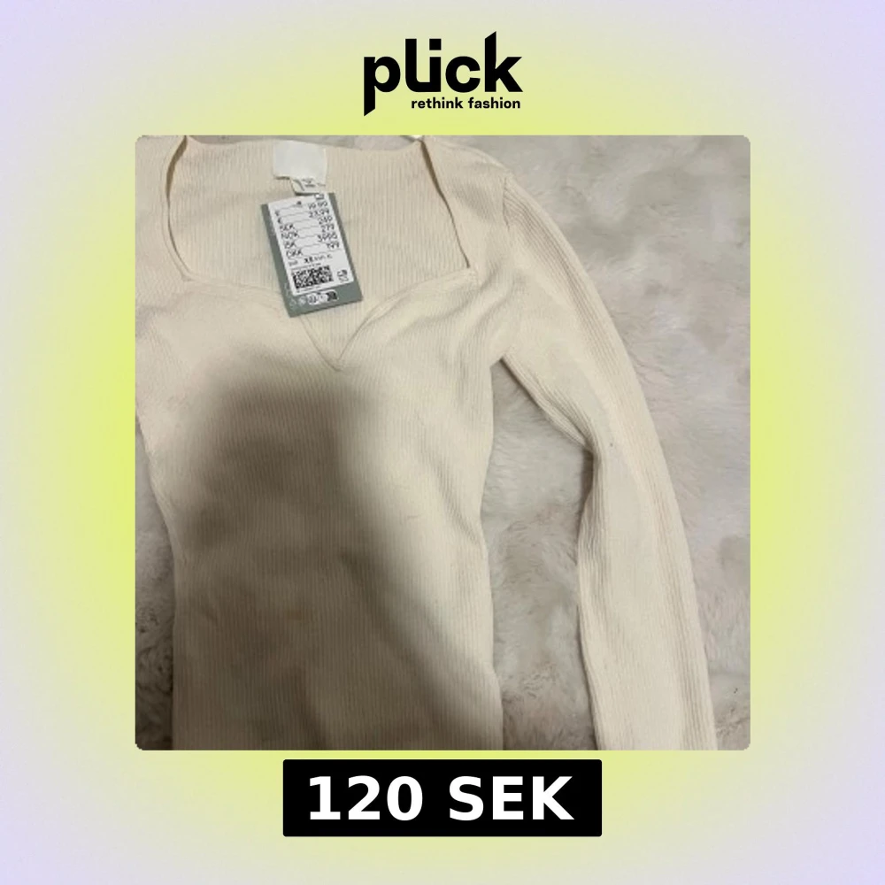 Säljer en ribbad vit långärmad topp från H&M med snygg v-ringning och figurnära passform. Toppen har en modern fyrkantig urringning och är perfekt att styla med jeans eller kjol för en trendig look.