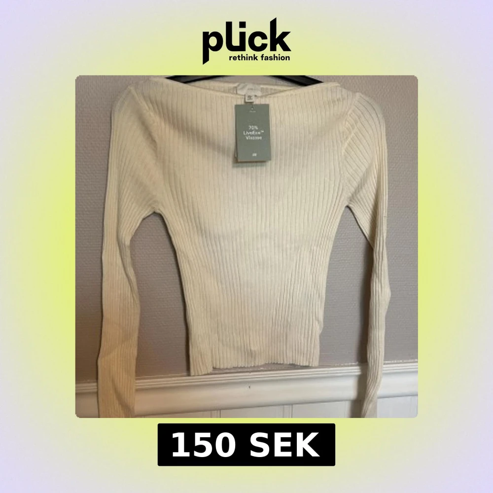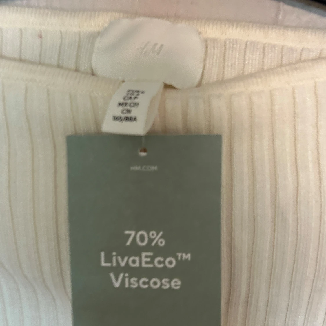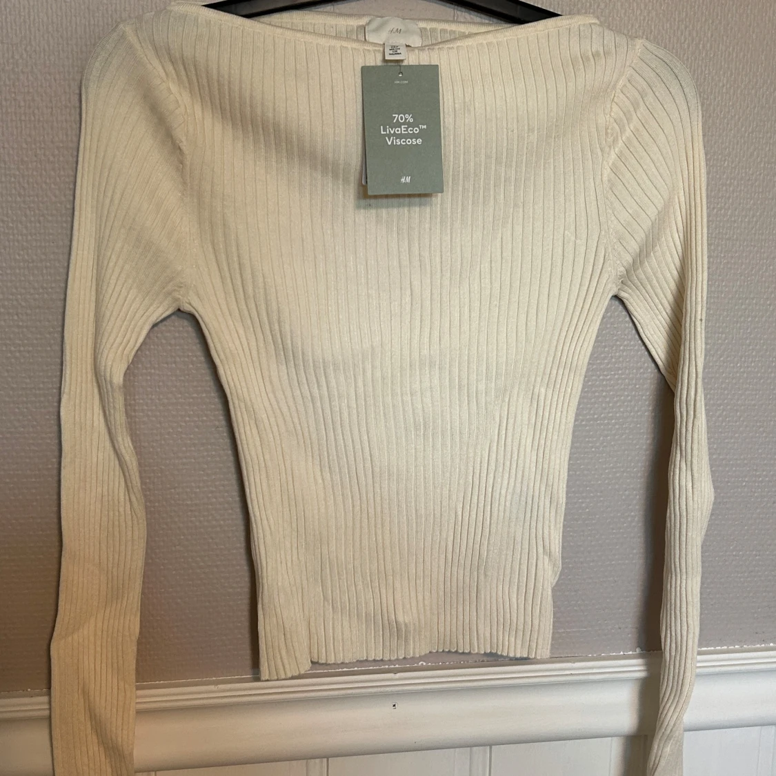 Ribbad långärmad topp från H&M i en fräsch vit färg. Toppen är figurnära och har en stilren, enkel design med rund halsringning. Tillverkad i 70% LivaEco viskos för en mjuk och skön känsla. Perfekt att styla med jeans eller kjol.