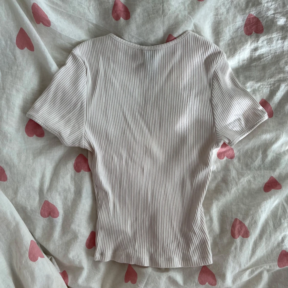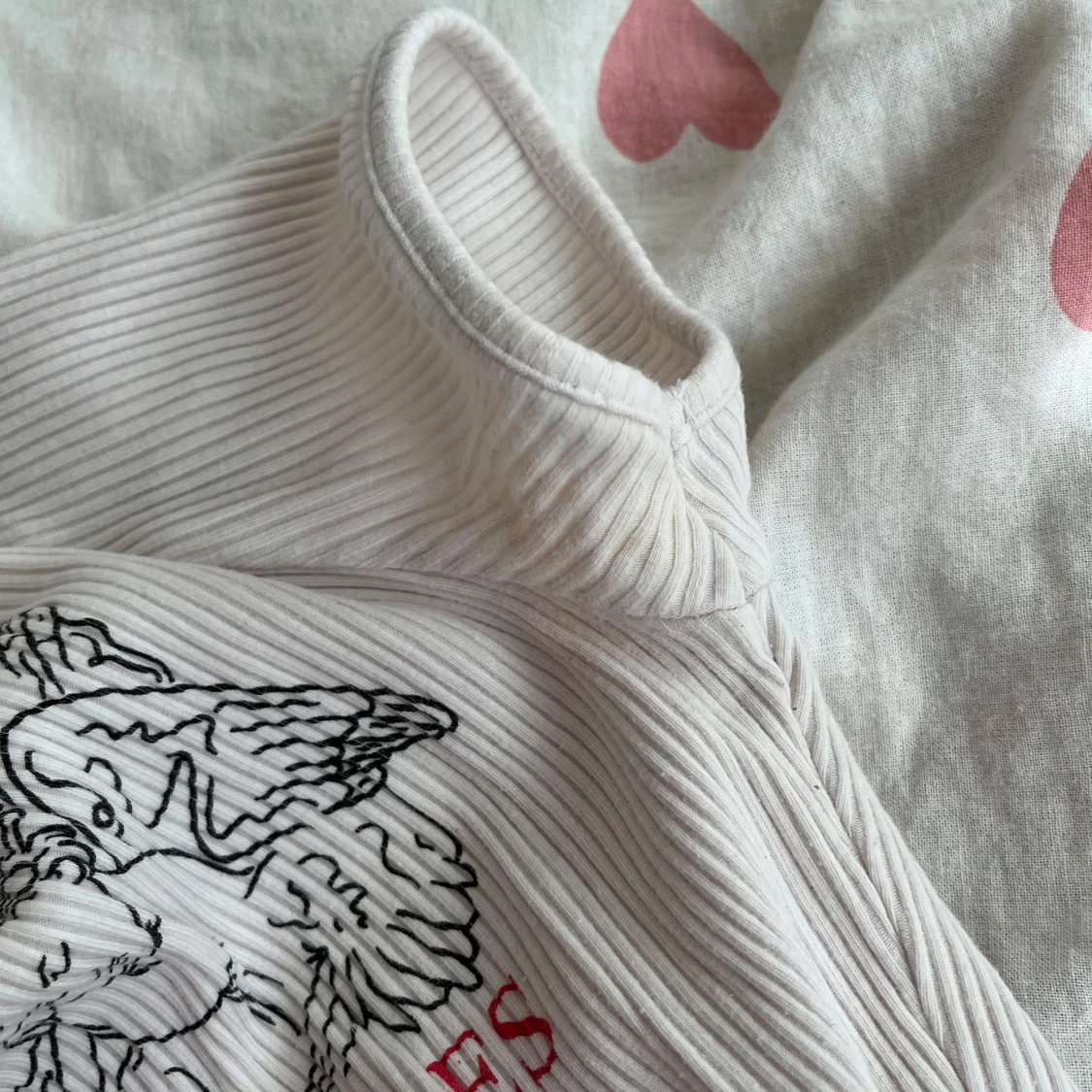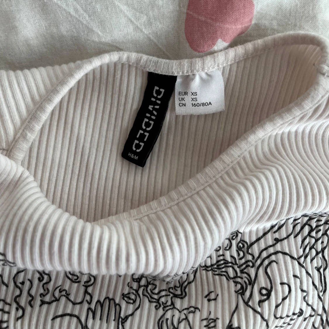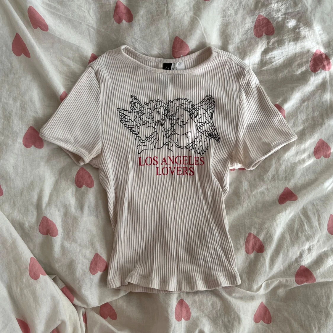 En ribbad croppad vit topp från H&M Divided i storlek XS. Toppen har korta ärmar och ett tryck med två änglar samt texten 'Los Angeles Lovers' i rött framtill!💞 Defekter: Missfärgning vid armhålorna, se de 2 sista bilderna
