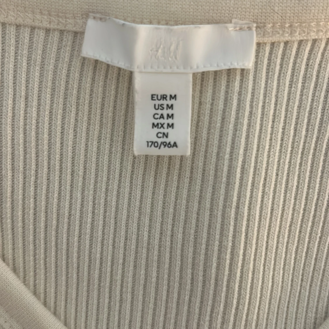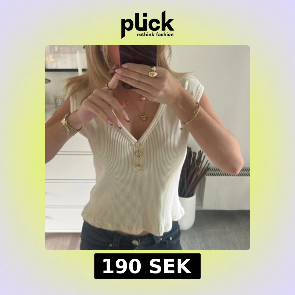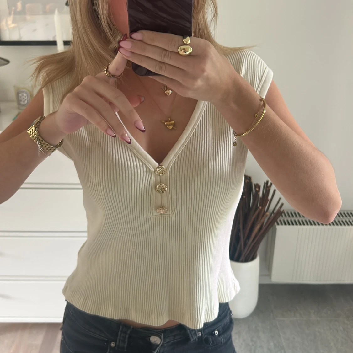 Säljer en ribbad vit topp från H&M i storlek M. Toppen har v-ringning och tre dekorativa guldfärgade knappar framtill. Modellen är croppad och ärmlös, perfekt för en chill och snygg look. Materialet är mjukt och stretchigt, troligtvis bomull eller syntet.
