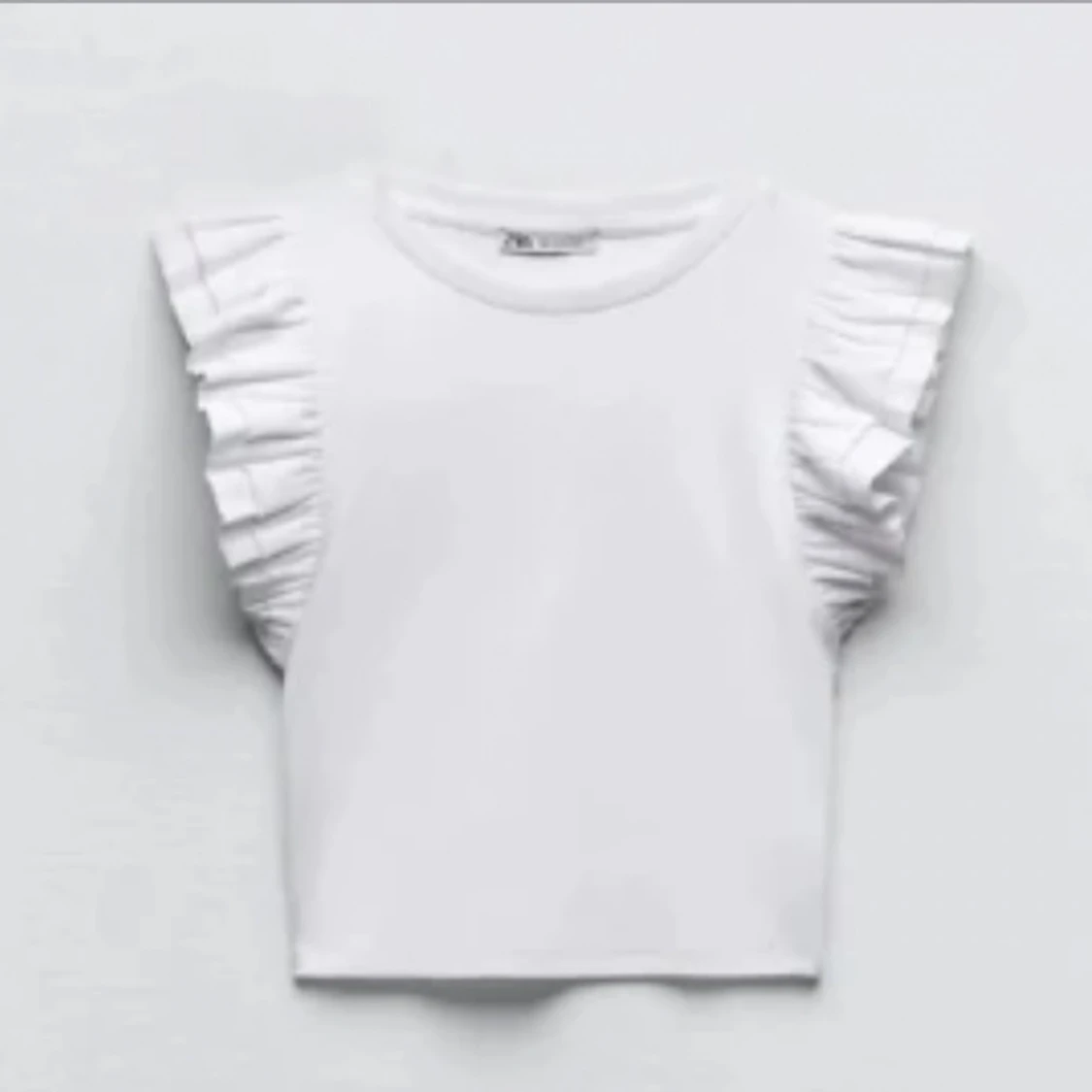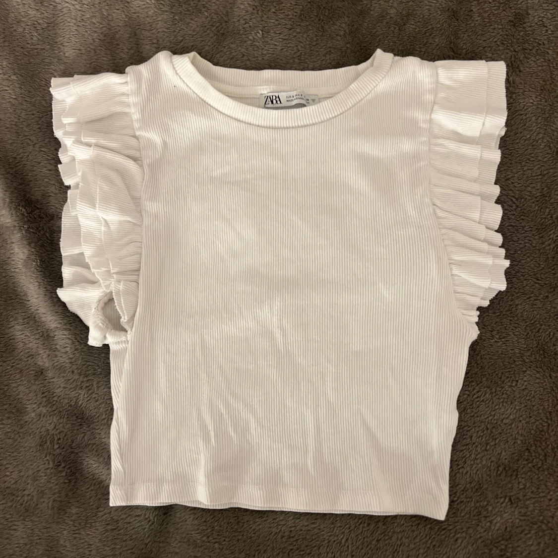 Säljer en söt vit ribbad topp från Zara med volangdetaljer på ärmarna. Använd fåtal gånger och har inga defekter.