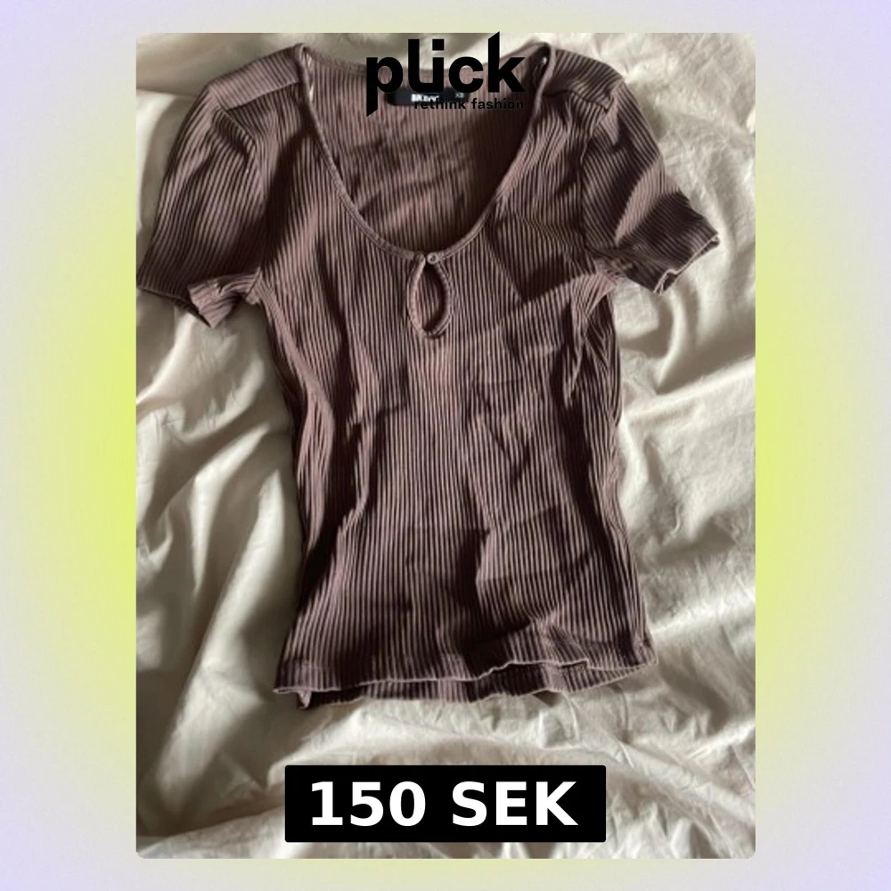 Säljer en ribbad brun topp från Bik Bok i storlek XS. Toppen har korta ärmar, rundad v-ringning med liten knappdetalj framtill och är i stretchigt material. Perfekt att styla med jeans eller kjol.