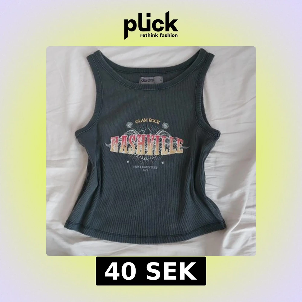 Snygg grå ribbad linnetopp från Primark med tryck 'Nashville Glam Rock Unplugged Tour 1973' i färgerna röd, gul och vit. Perfekt för en avslappnad stil med en touch av rock.