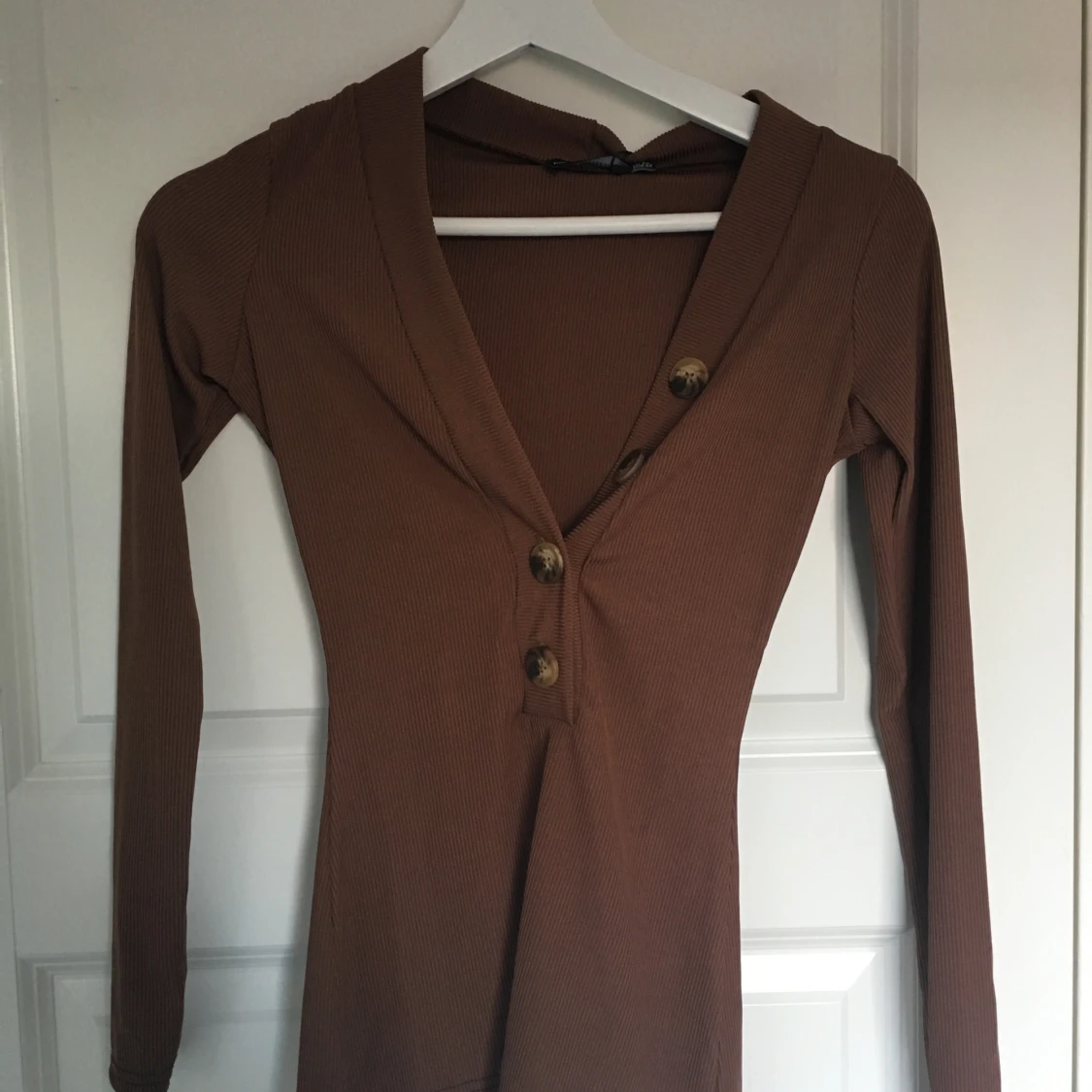 En brun, v-ringad, ribbad top med fyra knappar. Helt oanvänd och etiketten är fortfarande kvar. Säljer pga att den var för v-ringad för min smak. Köparen står för frakt.