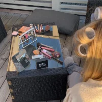 Rosa topp som är öppen i ryggen, man kan knyta den på lite olika sätt men jag gillar det med knuten fram.