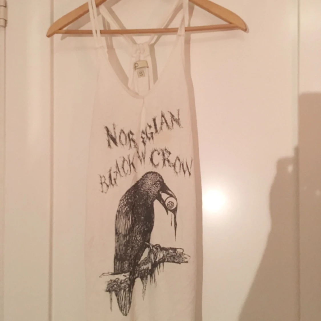 Vitt Linne med "brottarrygg" och ett motiv av en kråka och text som lyder "norweigan black crow", från carlings