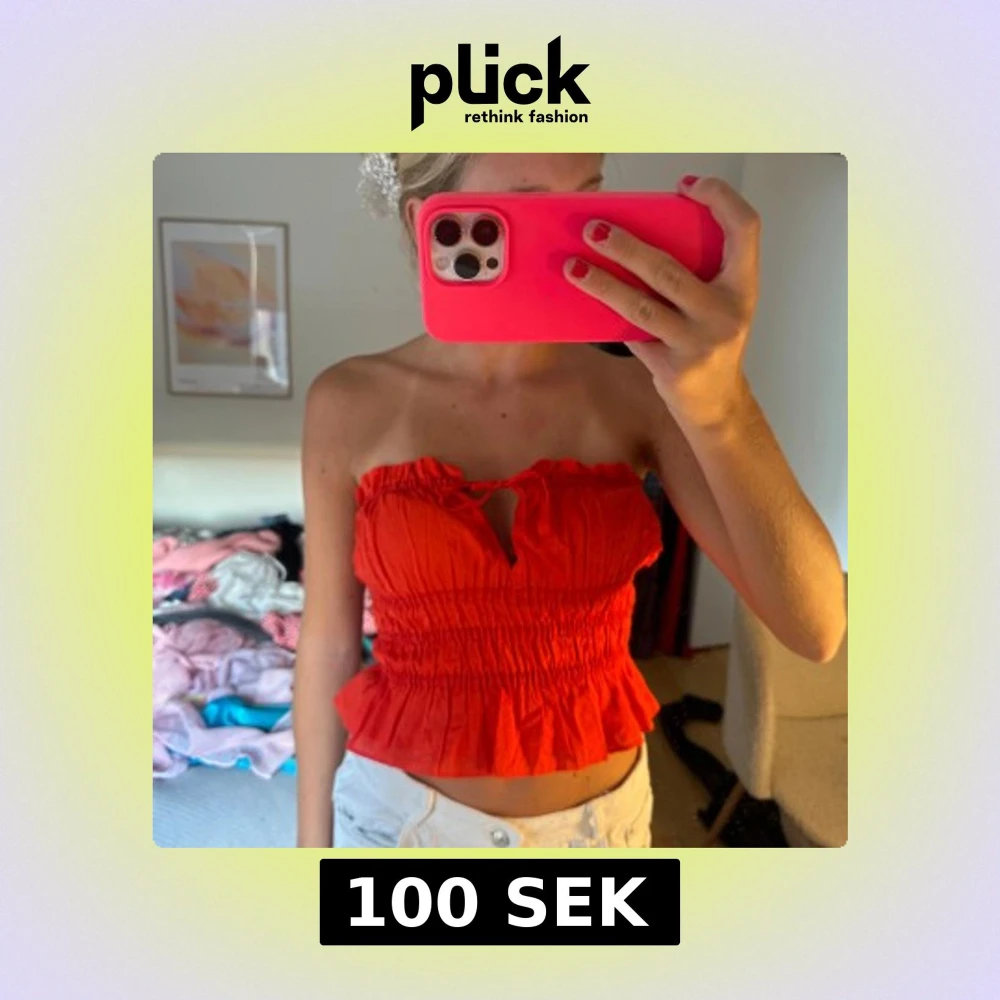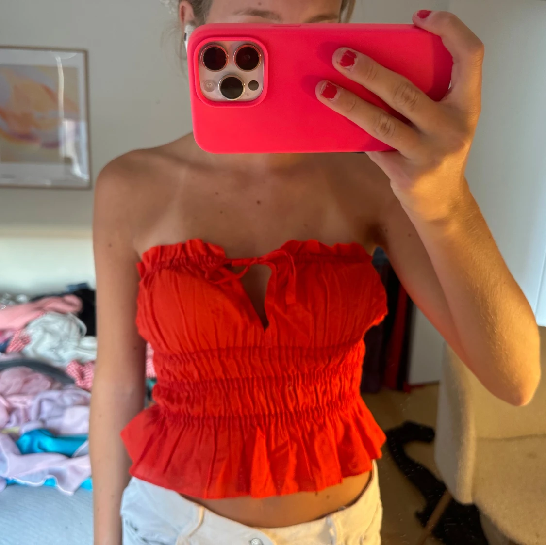 Säljer en röd bandeau tubtopp med smockad midja, volangkant nertill och söt knytning framtill. Från hm i storlek XS