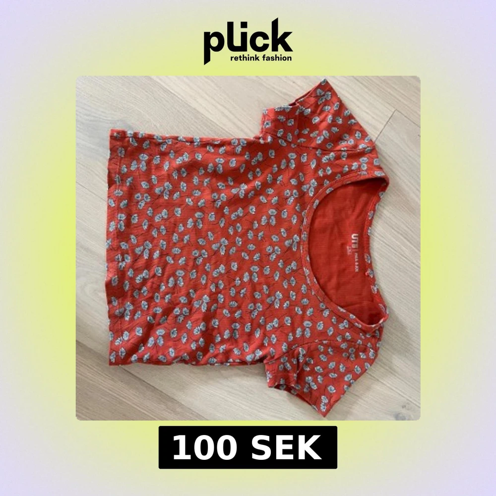 Kortärmad röd topp från Uniqlo med blåvitt blommigt mönster. Väl använd men ändå i bra skick. Färgen har tvättats av och det syns ett litet hål. Pris kan omdiskuteras! 💗