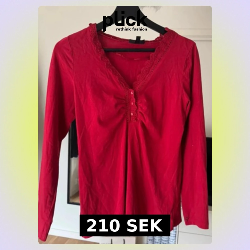 Snygg röd blus från KappAhl i storlek S med lång ärm och v-ringad hals. Blusen har dekorativ spets runt halsringningen och knappar framtill. Materialet är mjukt och lätt, perfekt för dig som gillar detaljer och färg.