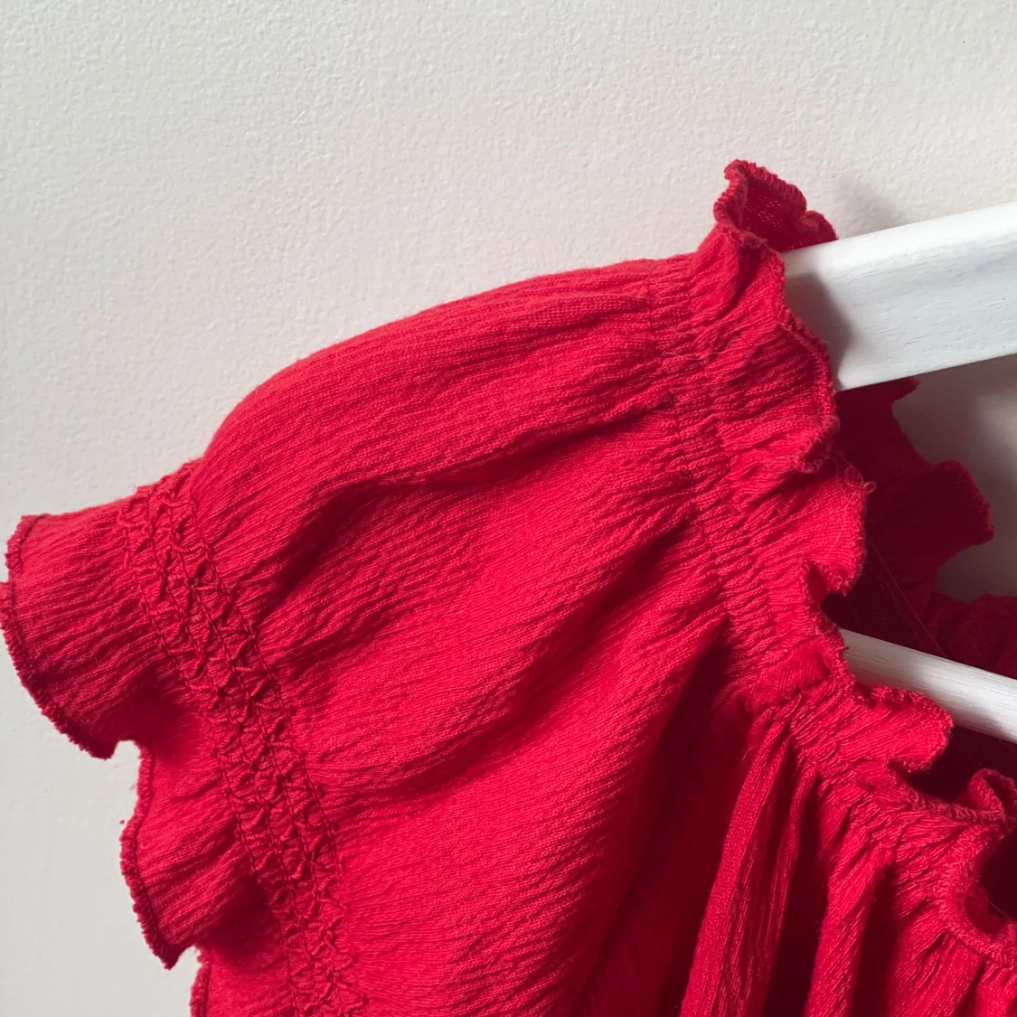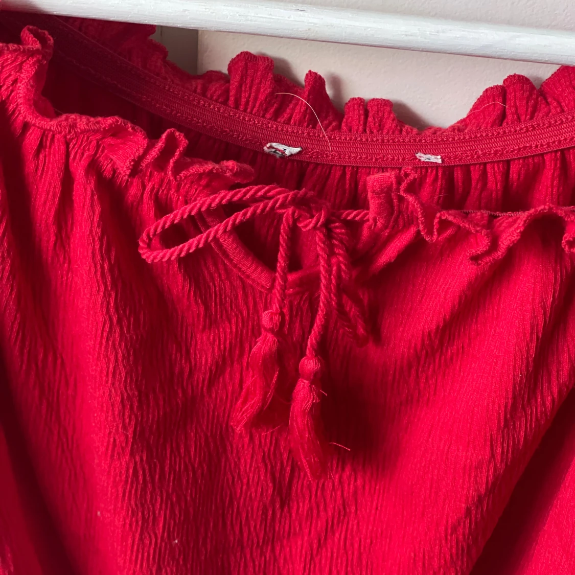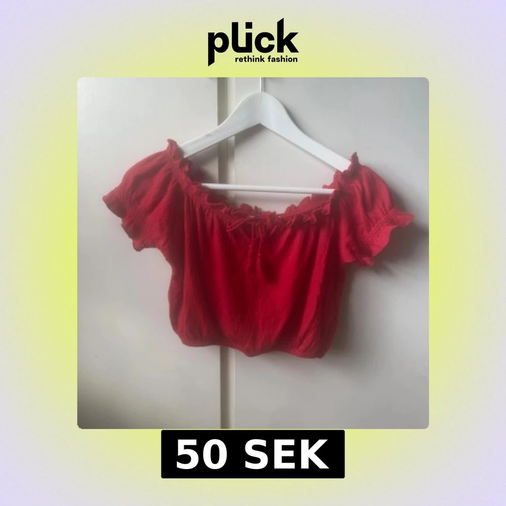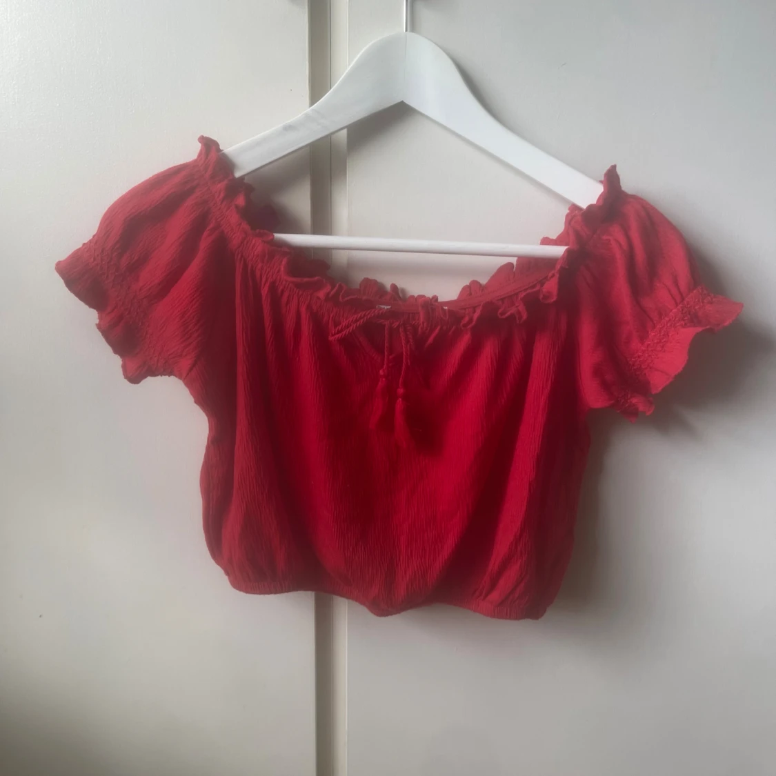 Säljer en röd croppad blus med offshoulder och korta ärmar. Toppen har volangdetaljer runt halsringningen och ärmarna samt en snygg knytning framtill. Lappen sitter tyvärr inte kvar så vet inte exakt storlek och vart den är ifrån☺️