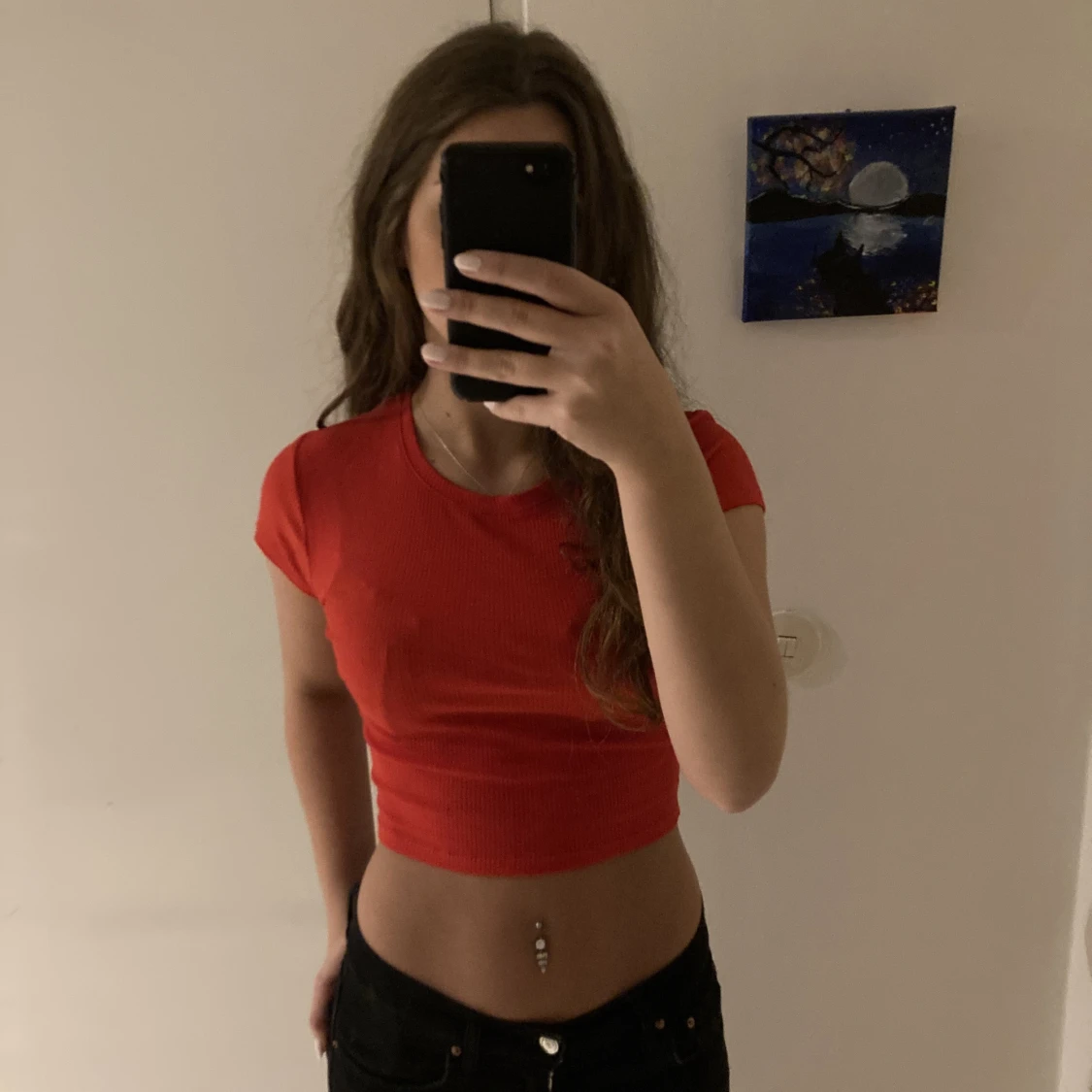 Söt röd topp, aldrig använt. Storlek XS eller S står inte på tröjan men passar mig som brukar ha S
