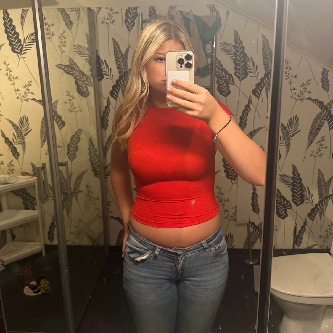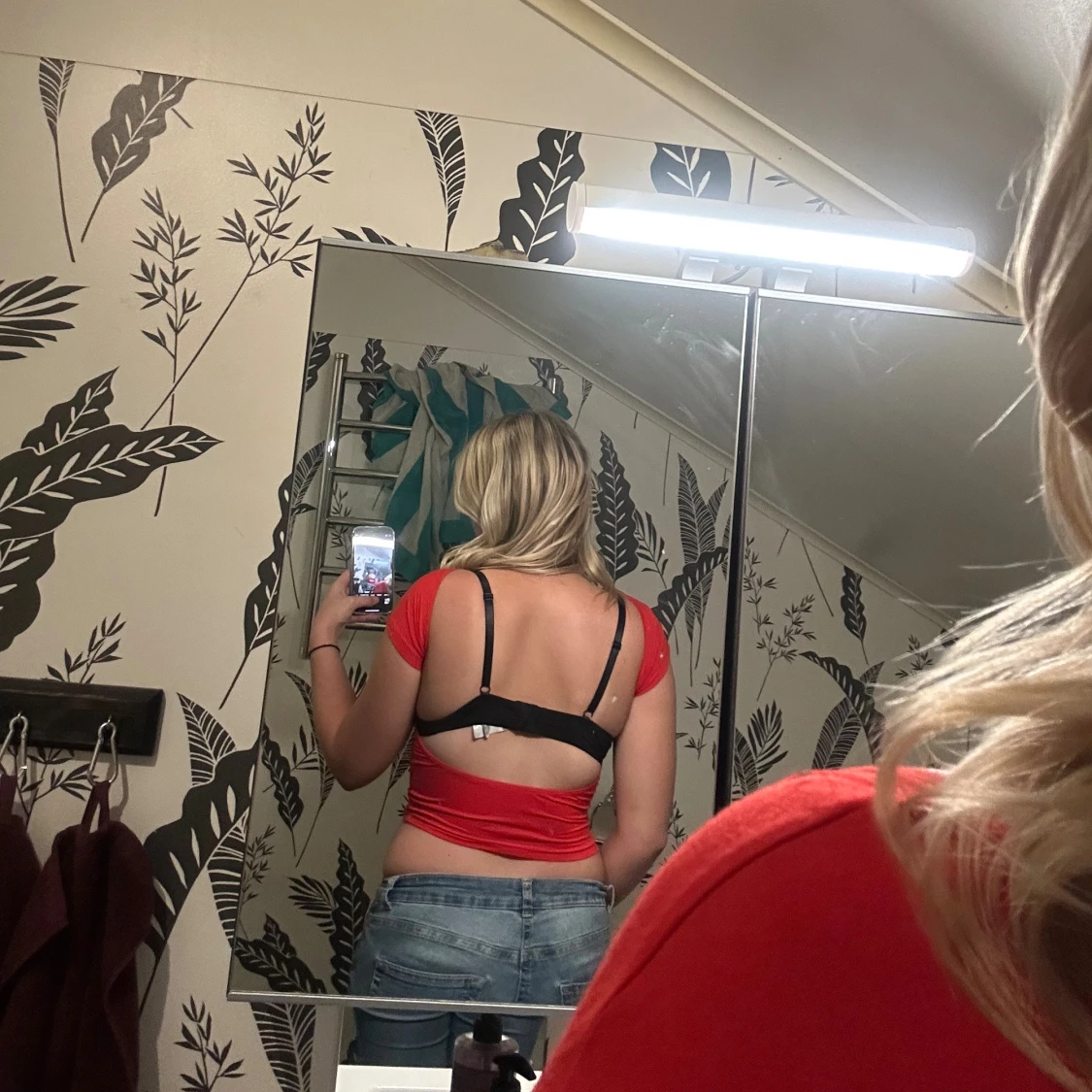 Säljer en röd croppad topp med tight passform och korta ärmar. Toppen har en snygg öppen rygg som ger en cool look. Perfekt för dig som vill sticka ut med en färgstark och trendig topp. Materialet känns stretchigt och följsamt.