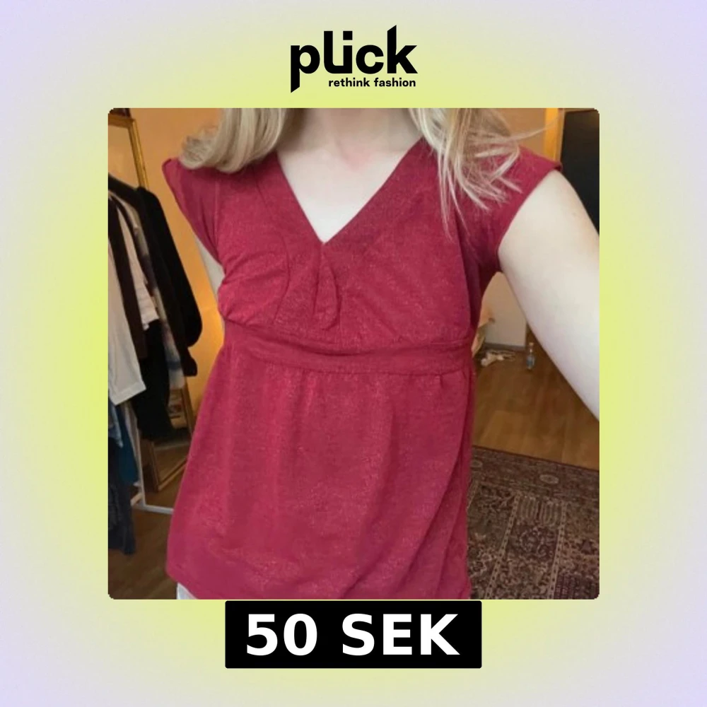 Säljer en röd glittrig topp med v-ringning och korta ärmar. Perfekt för att lysa upp vilken outfit som helst. Toppen har en fin detalj vid bysten som ger en extra touch.