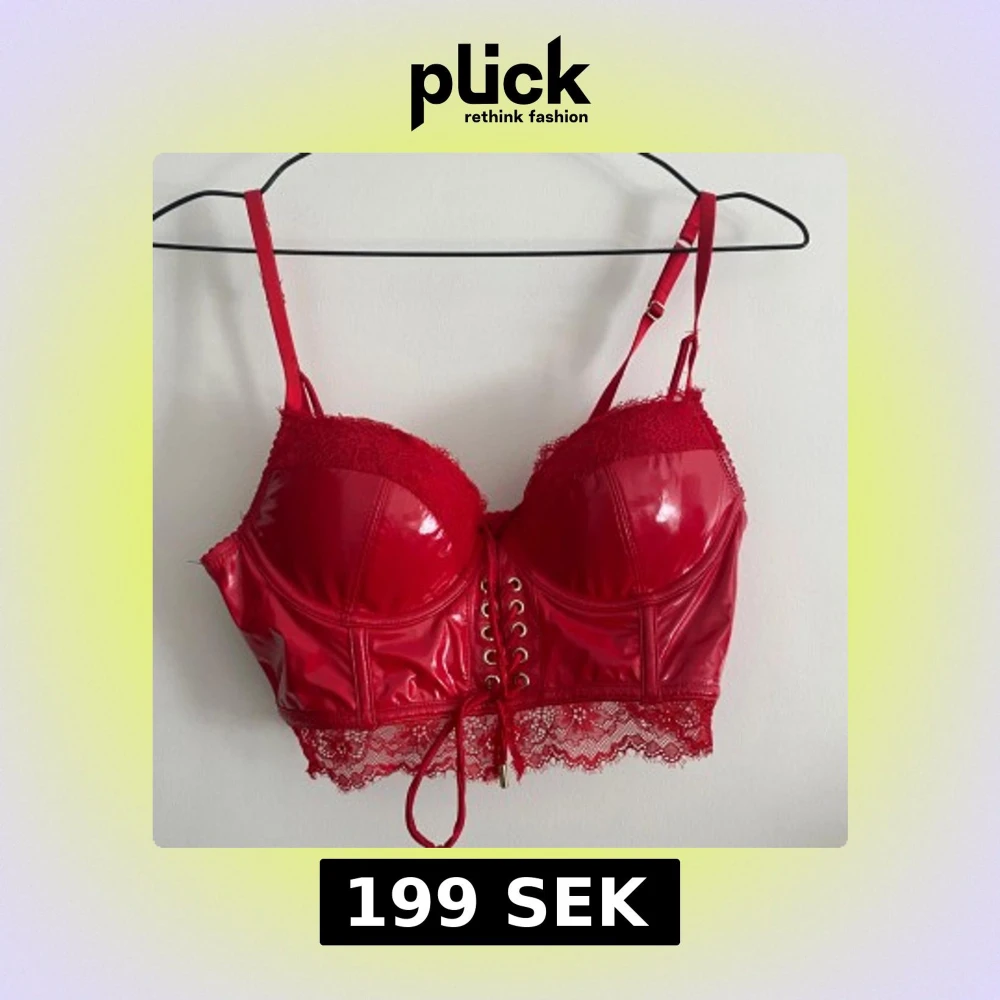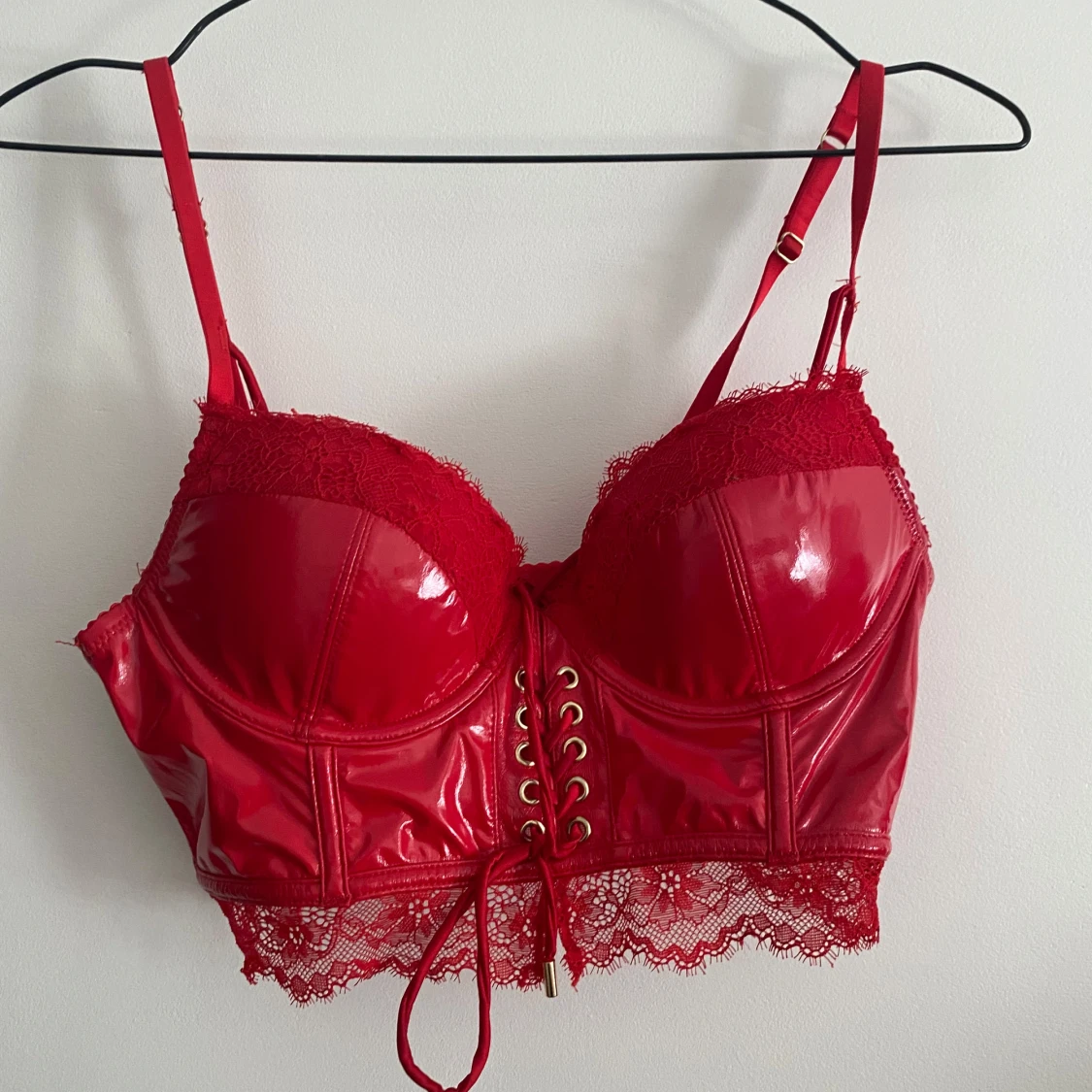 Snygg röd korsett i glansigt material med spetsdetaljer och snörning framtill. Justerbara axelband för perfekt passform. Perfekt för en kväll ute eller speciella tillfällen.