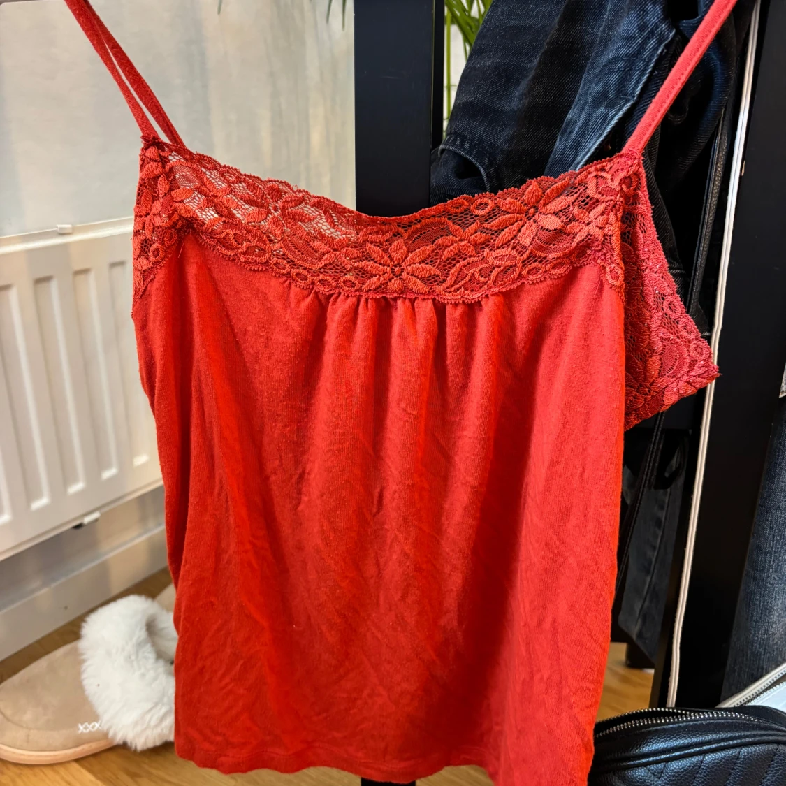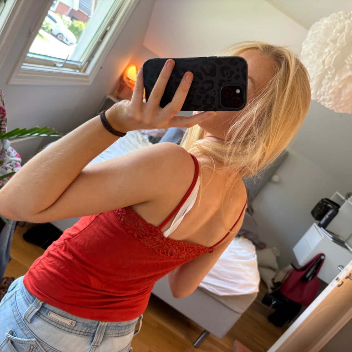 Supersöt röd linnetopp med tunna axelband och bred spetskant upptill. Toppen är figurnära och Perfekt att matcha med jeans eller kjol för en super söt outfit!❤️🌹