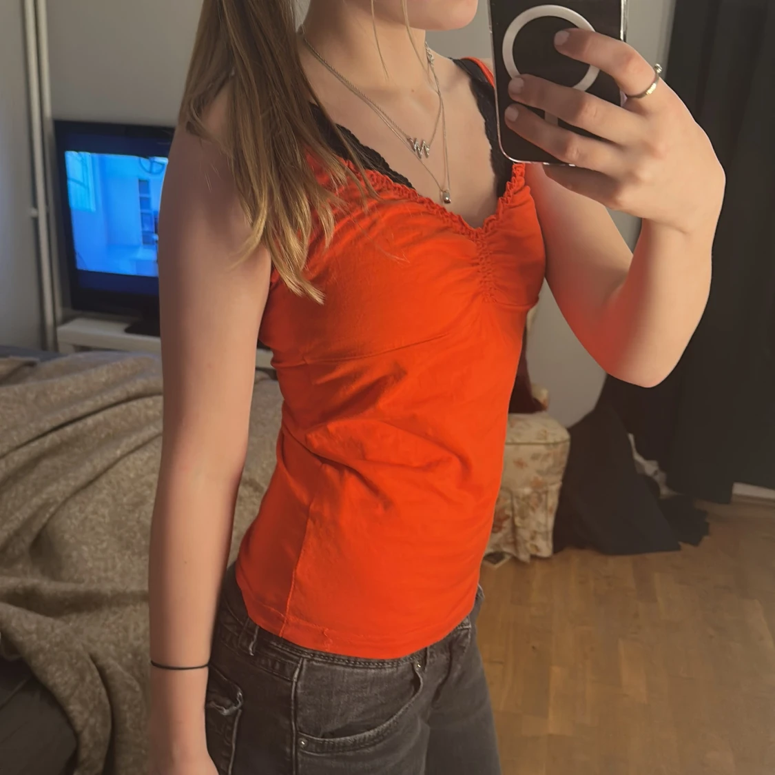 Den ser väldigt orange ut i kameran men i verkligheten är den röd. Säljer för jag bytt stil. Köp gärna på instabox