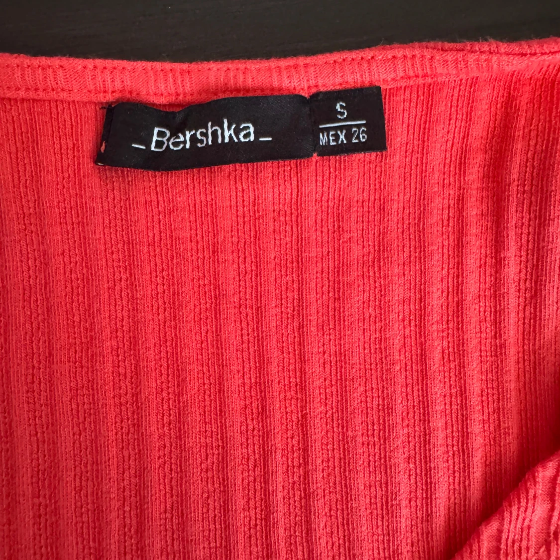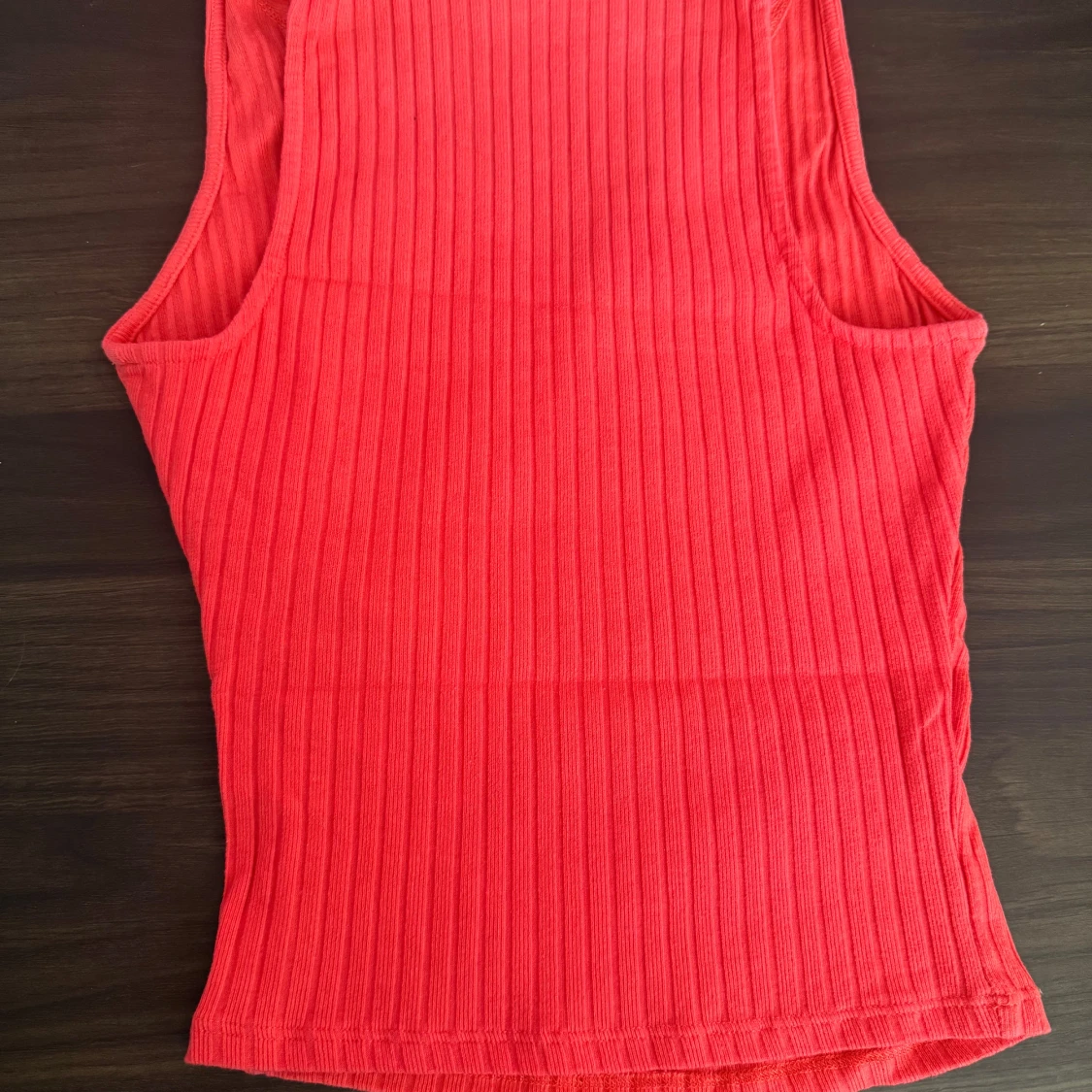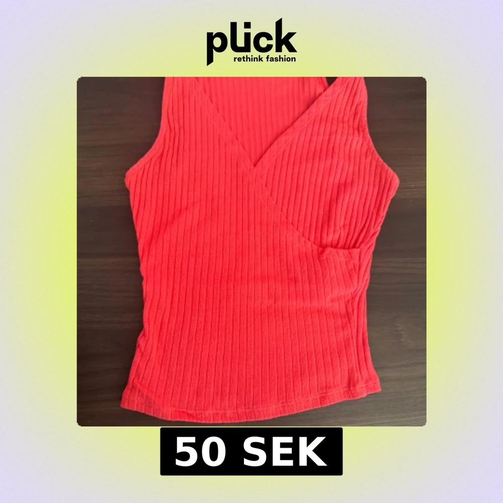 Säljer en snygg röd ribbad omlottopp från Bershka. Toppen är ärmlös och har en stilren omlottdesign som ger en modern look. Perfekt för att lyfta vilken outfit som helst. Passar bra till både jeans och kjol!