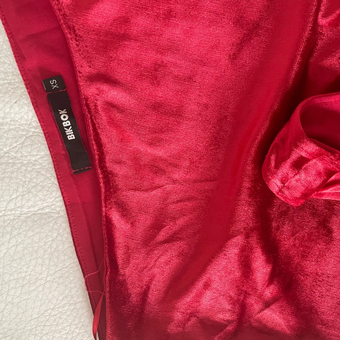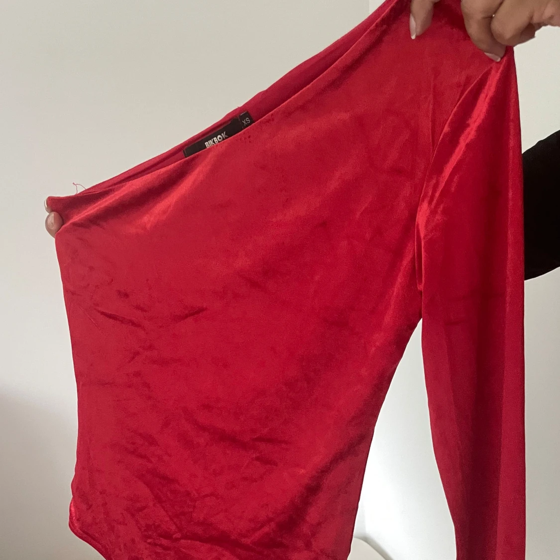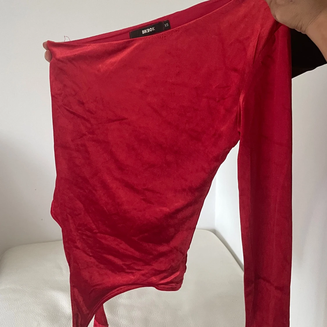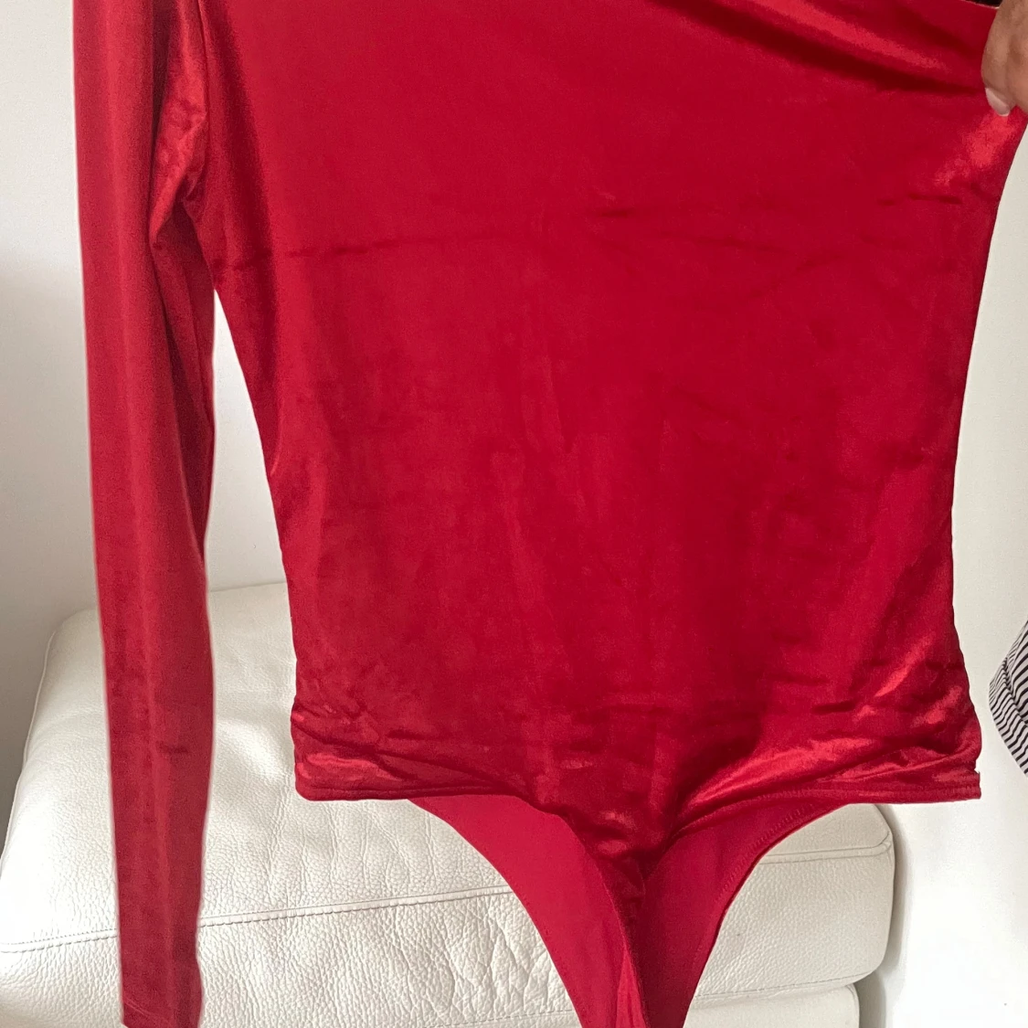 Säljer en röd body i sammetsmaterial från Bik Bok i storlek XS. Bodyn har lång ärm och en tight passform som sitter snyggt på kroppen.