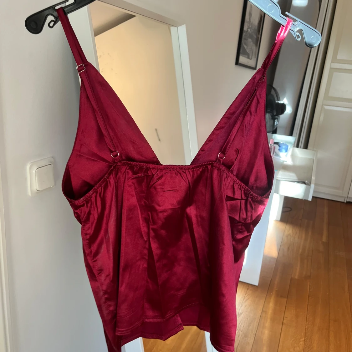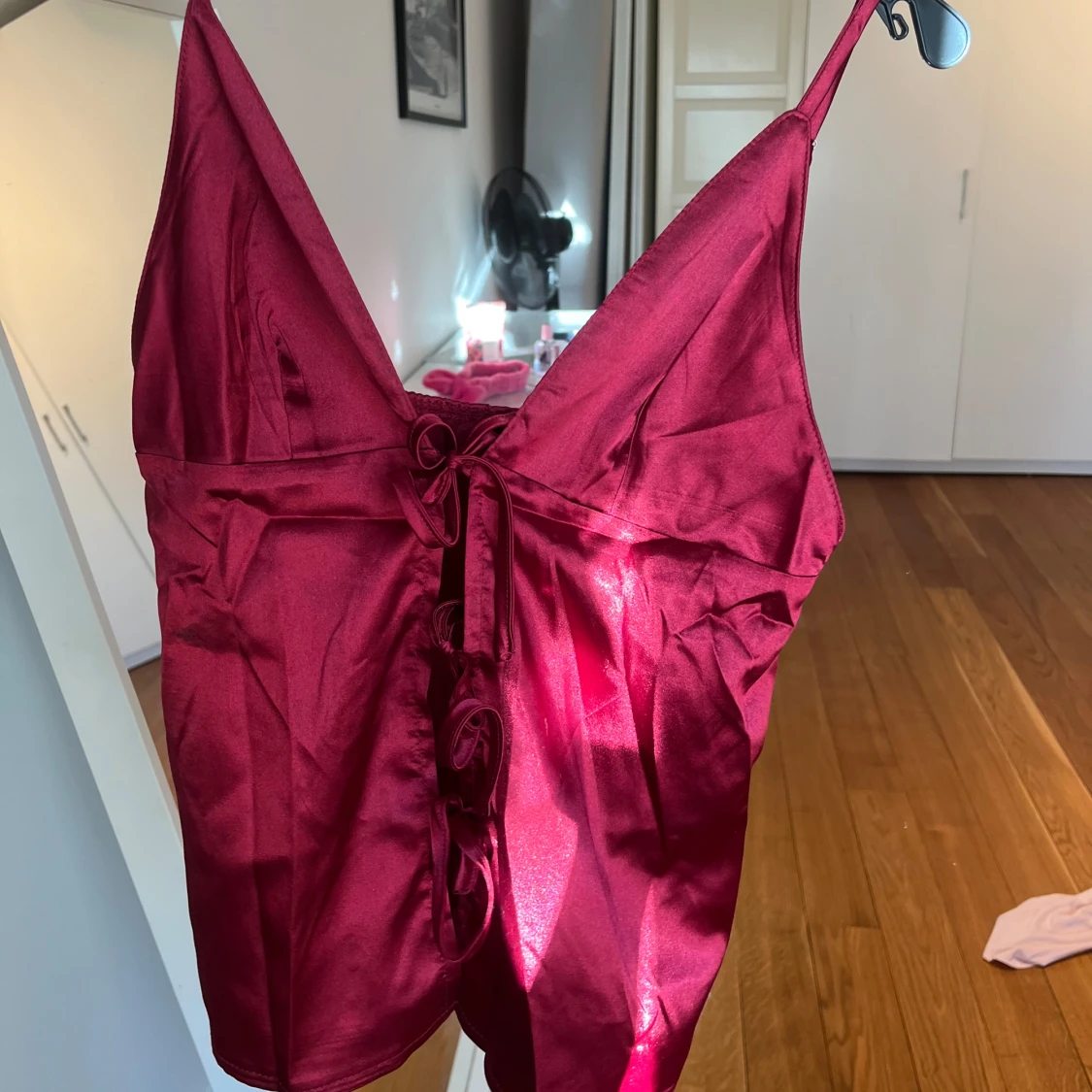 Snygg röd satinlinne med justerbara axelband och knytning framtill. Perfekt för en kväll ute eller en speciell tillställning. Linnet har en glansig finish som ger en lyxig känsla.