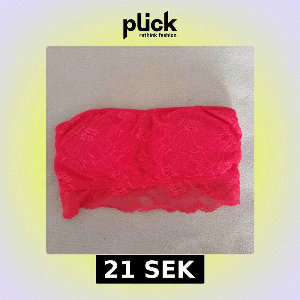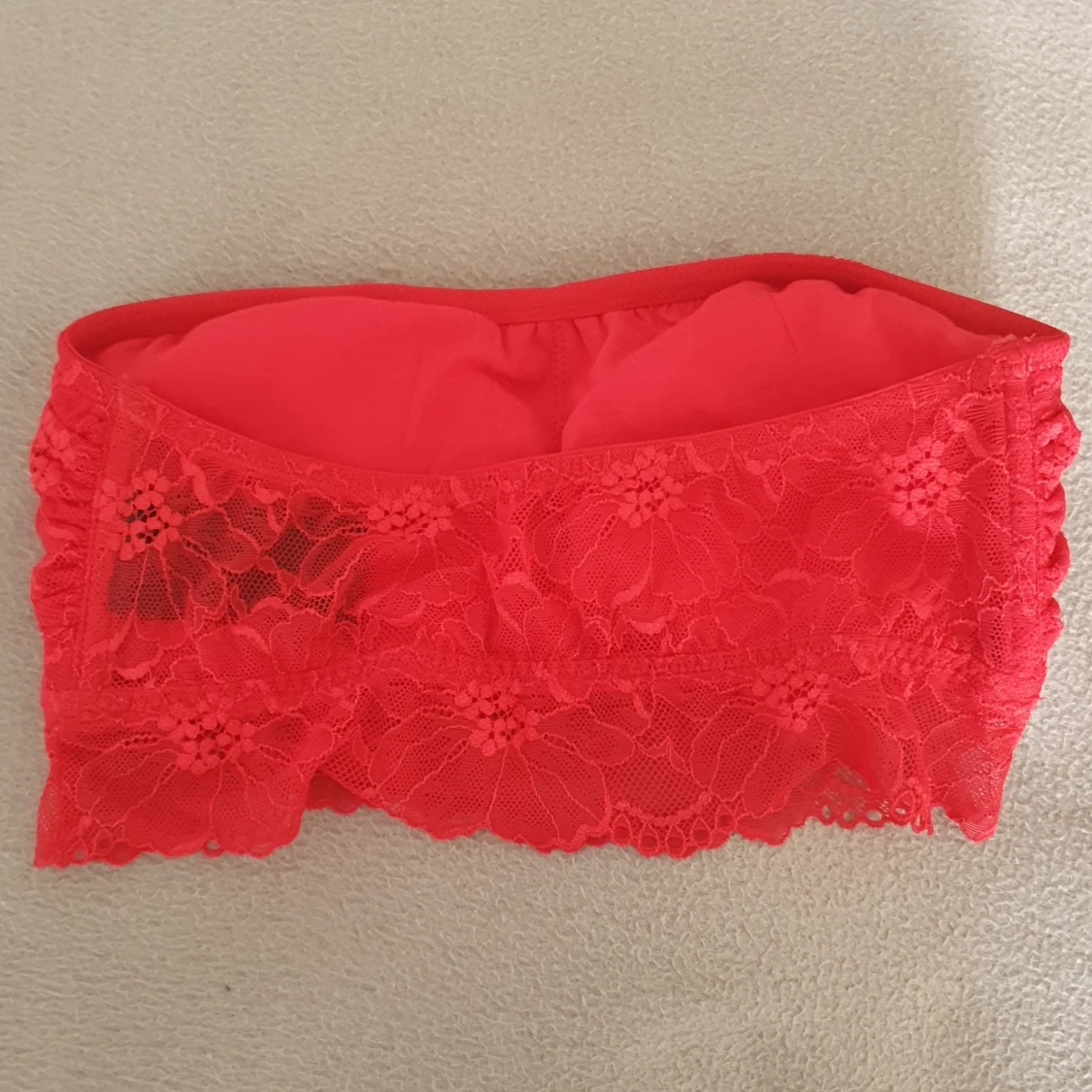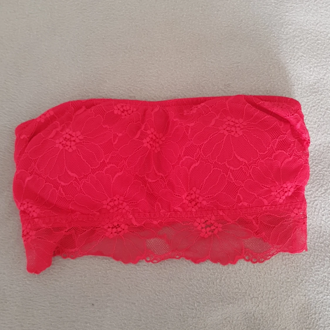 Säljer en snygg bandeau topp från H&M i stark röd färg (mörkare röd i verkligheten men svårt att fånga på bild). Toppen är helt ärmlös och täckt av blommig spets med transparent nederkant. Stödskenor i sidan och uttagbara inlägg. Bomullsblandning i innertyget så den är skön mot huden. Använd max 3ggr. Pris kan diskuteras