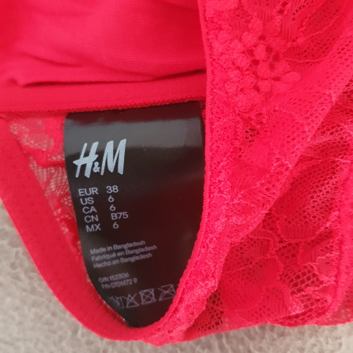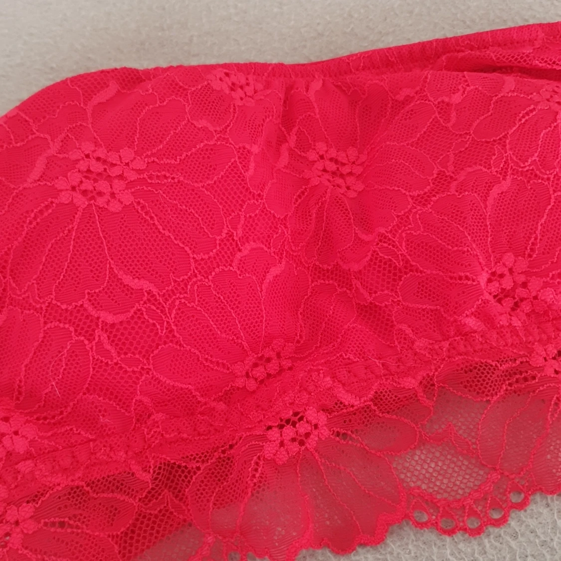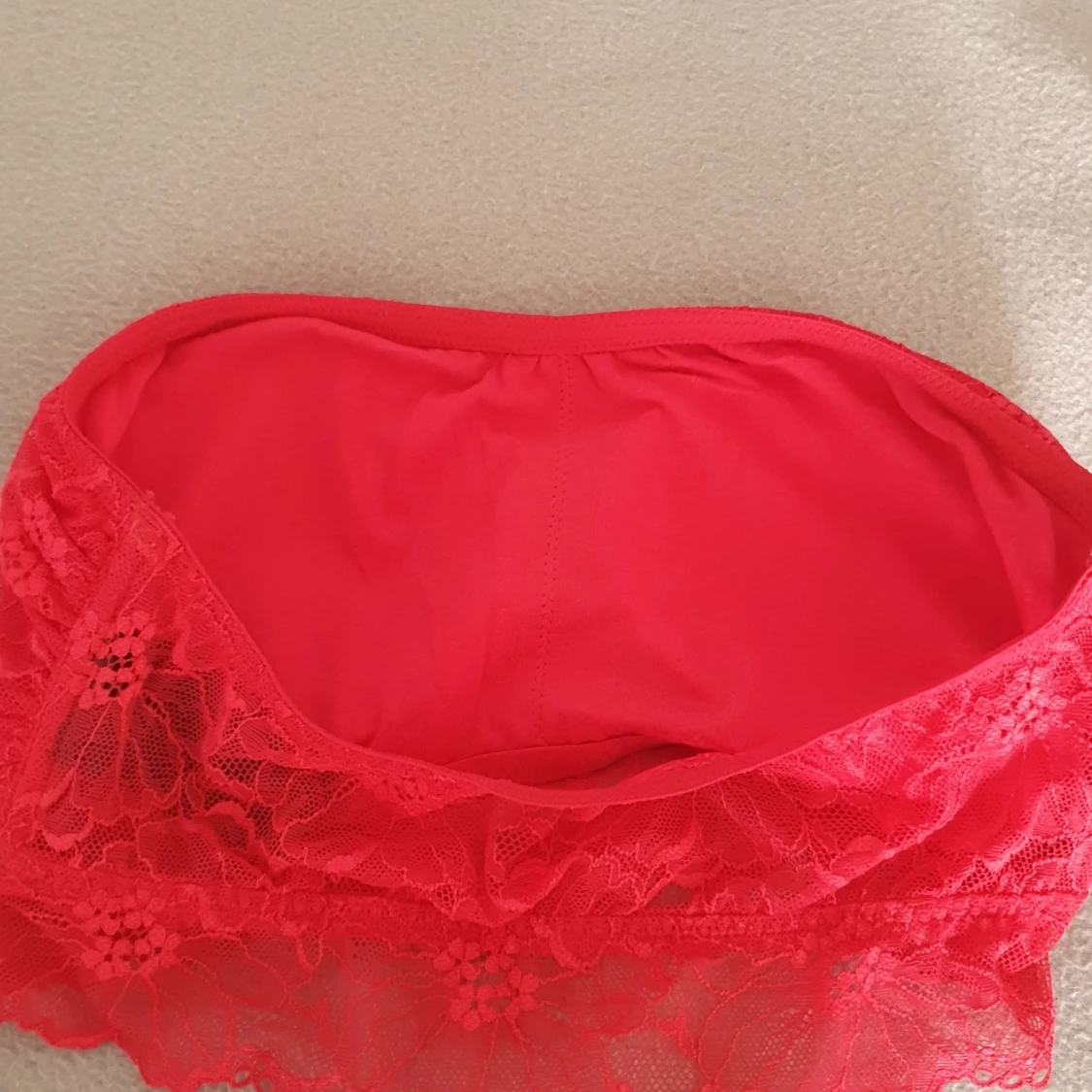 Säljer en snygg bandeau topp från H&M i stark röd färg (mörkare röd i verkligheten men svårt att fånga på bild). Toppen är helt ärmlös och täckt av blommig spets med transparent nederkant. Stödskenor i sidan och uttagbara inlägg. Bomullsblandning i innertyget så den är skön mot huden. Använd max 3ggr. Pris kan diskuteras