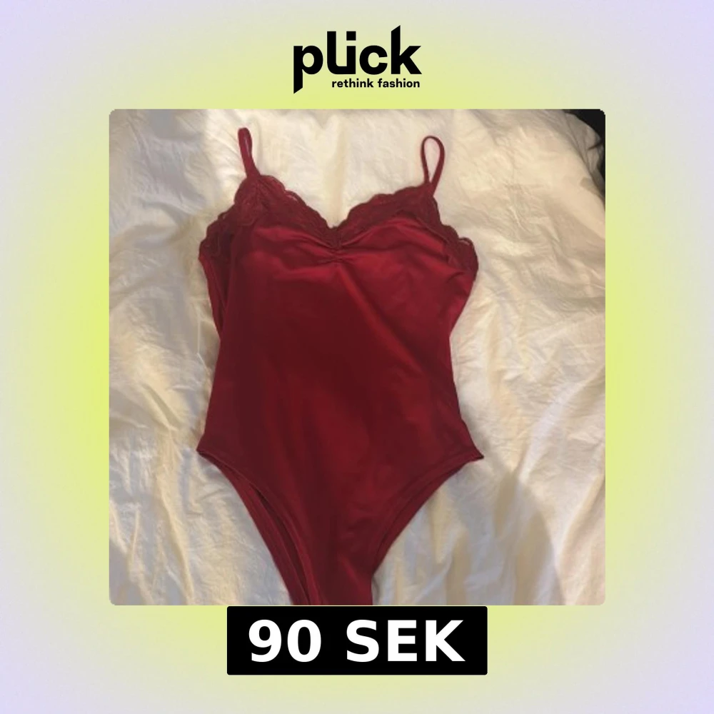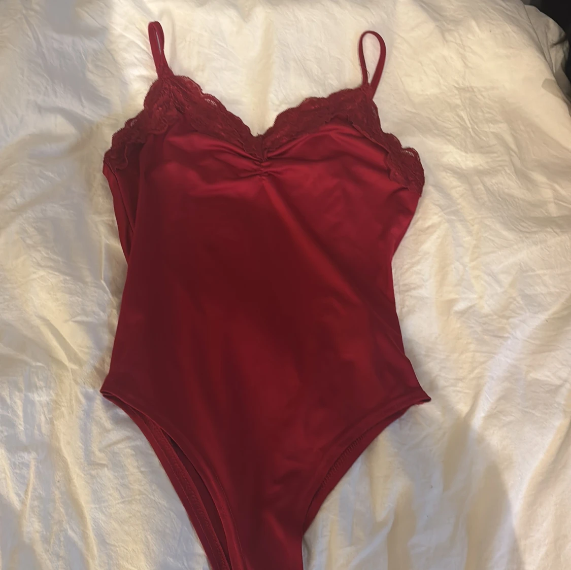 Snygg röd bodysuit från SHEIN med tunna axelband och spetsdetaljer vid bysten. Modellen är figurnära och har en djup v-ringning framtill. Perfekt att styla med jeans eller kjol för en trendig look. Passar också för xxs. Andvänts 1 gång.