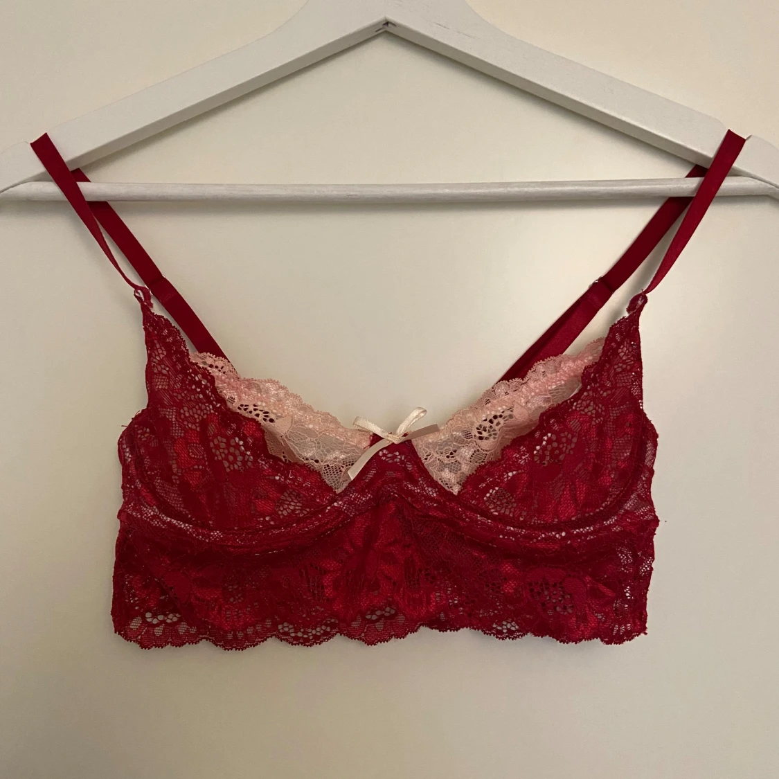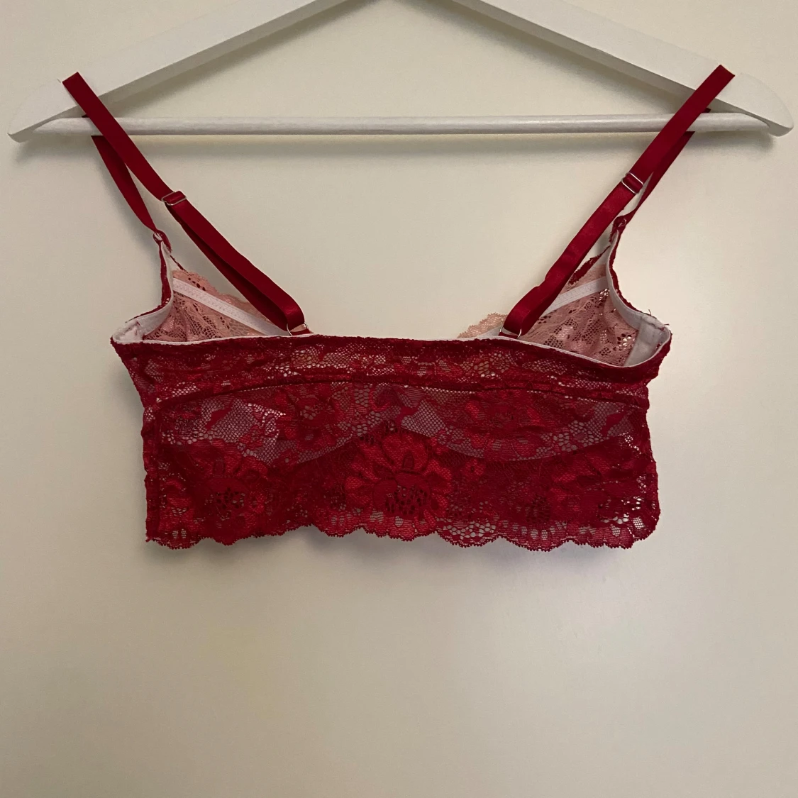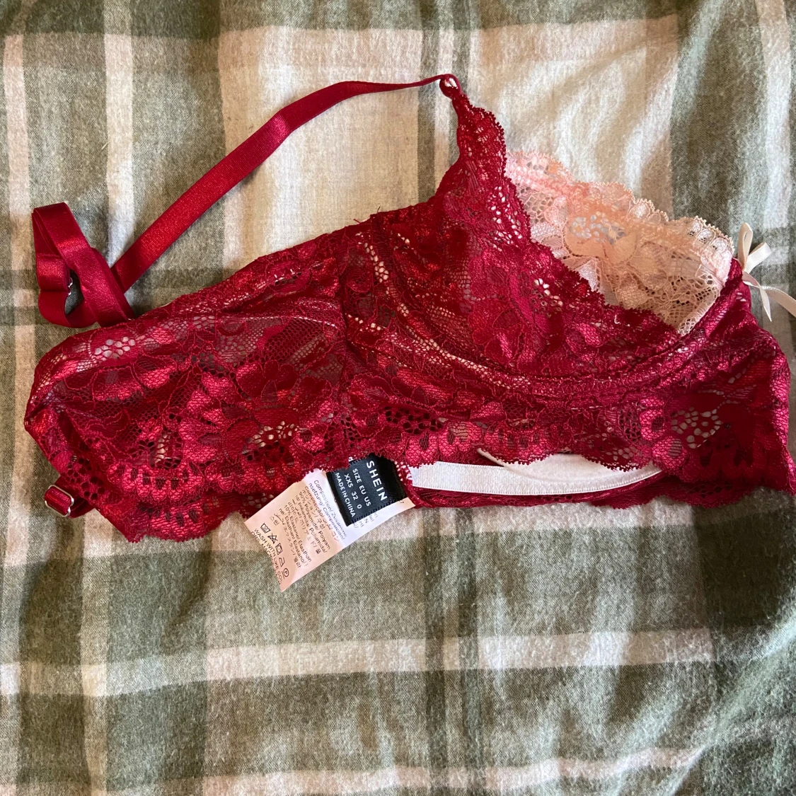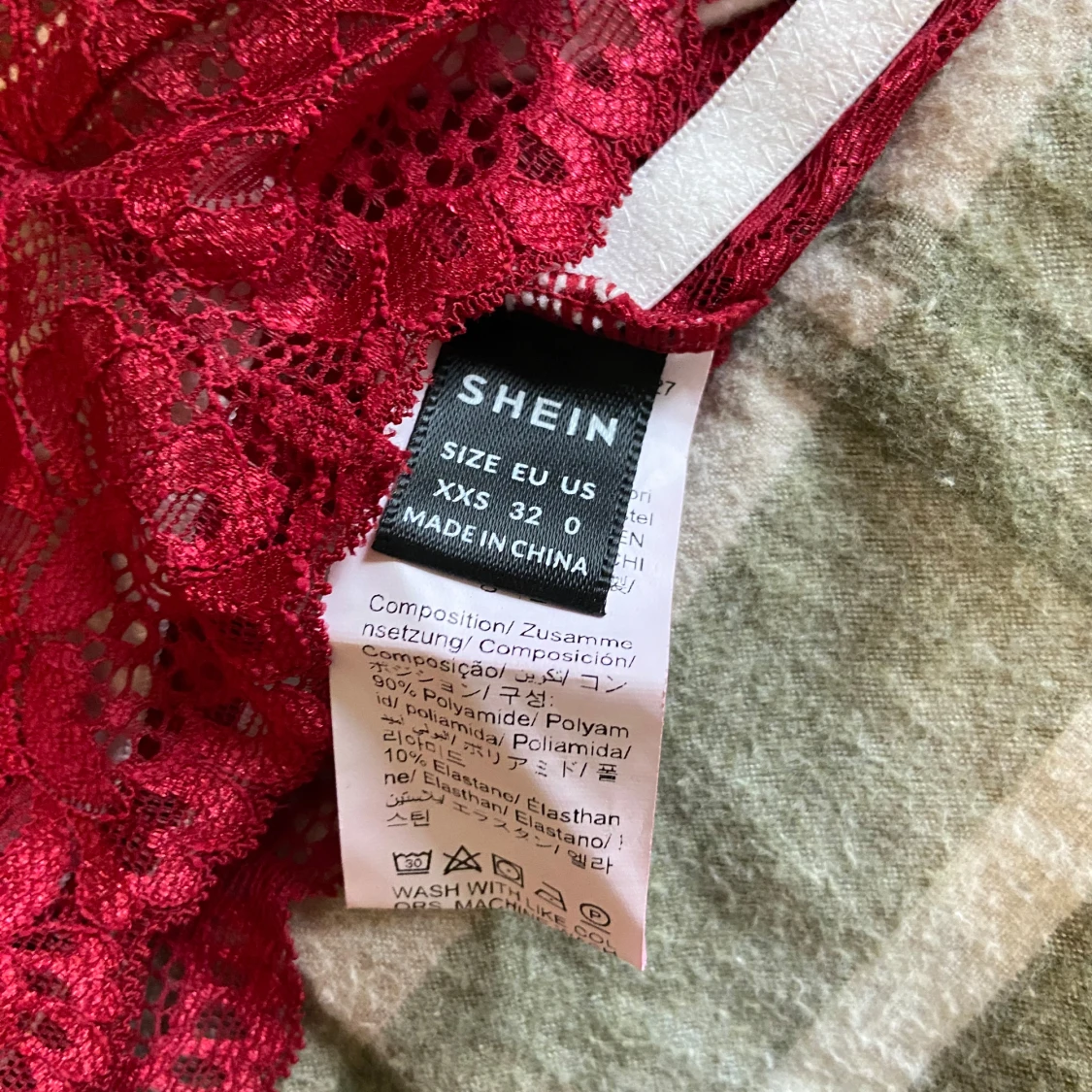 Säljer en röd spetsig linnetopp från SHEIN i storlek XXS. Toppen har tunna axelband, ljusrosa spetsdetalj upptill och en liten rosett framtill. Materialet är syntet med stretch och den har en romantisk vibe med blommönstrad spets.
