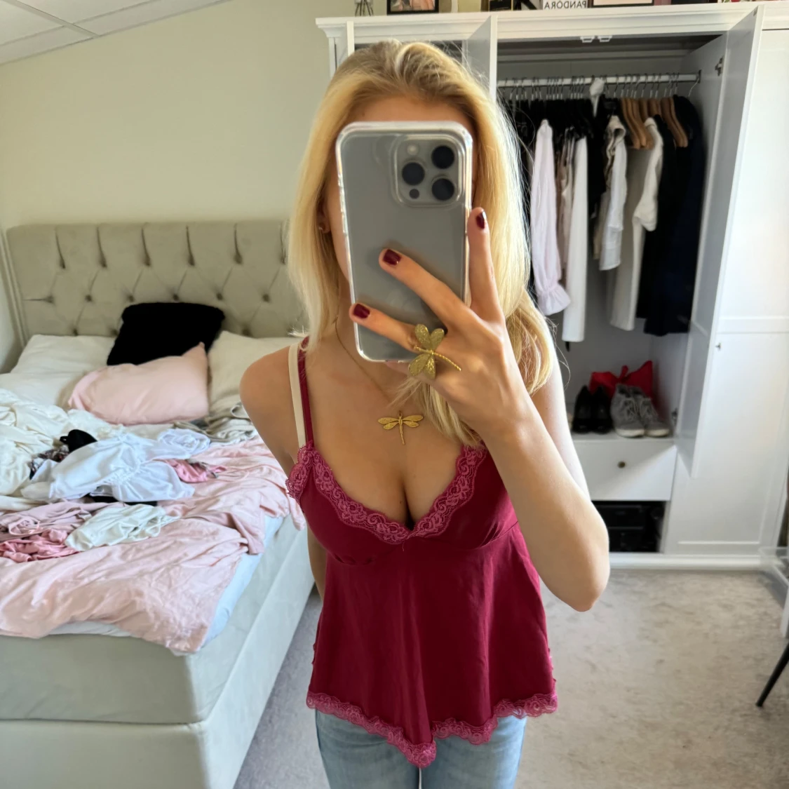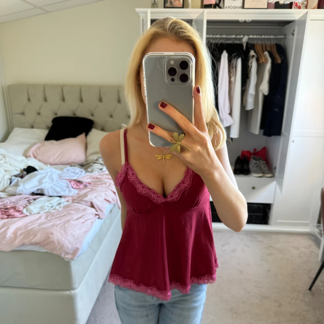skitsnygg och söt röd topp med spetts upptill som kan användas som både fest och vardagstopp.