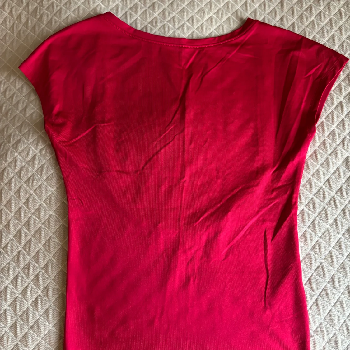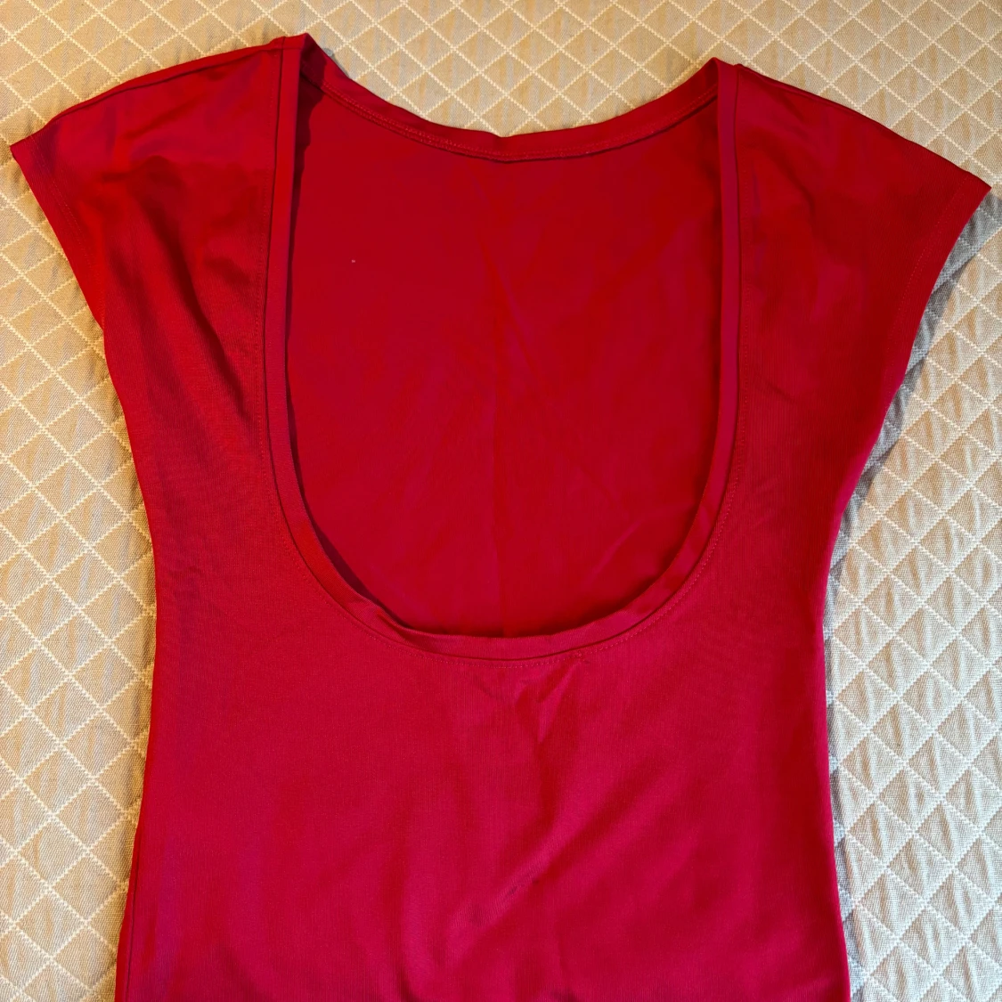 Säljer en snygg röd topp i stretchigt bomullsmaterial. Toppen har korta ärmar och en djup, öppen rygg som ger en cool och trendig look. Perfekt att styla med jeans eller kjol för en färgstark outfit.