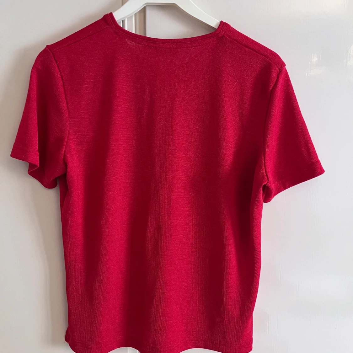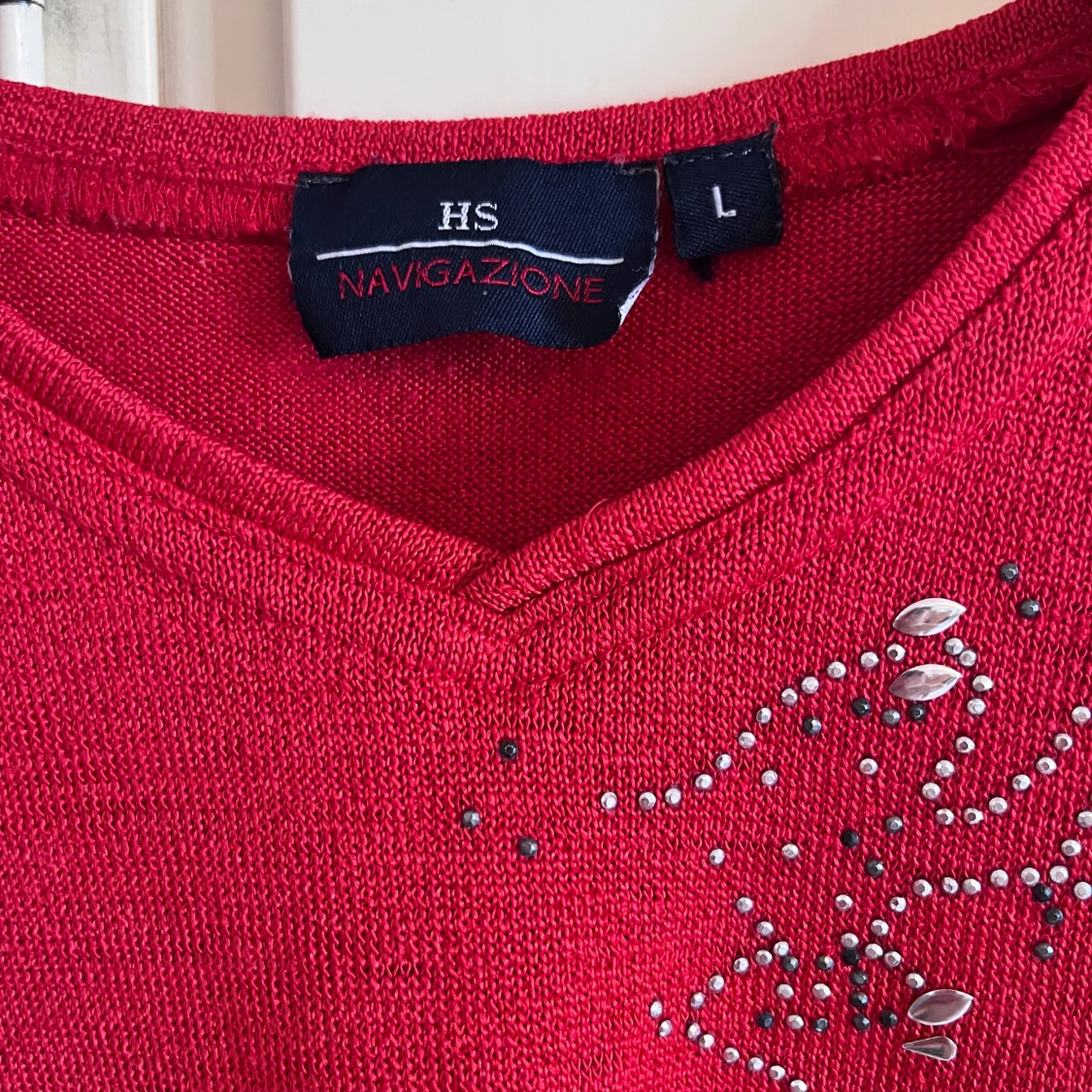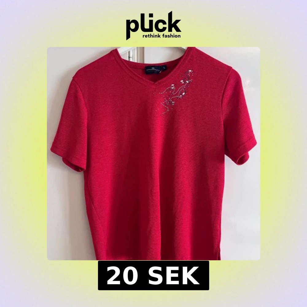 Röd topp från Navigazione med v-ringning och korta ärmar. Toppen har dekorativa strasstenar och små silvriga detaljer vid axeln som ger en snygg touch. Materialet är mjukt och lättstickat, perfekt för dig som gillar färg och lite extra bling.