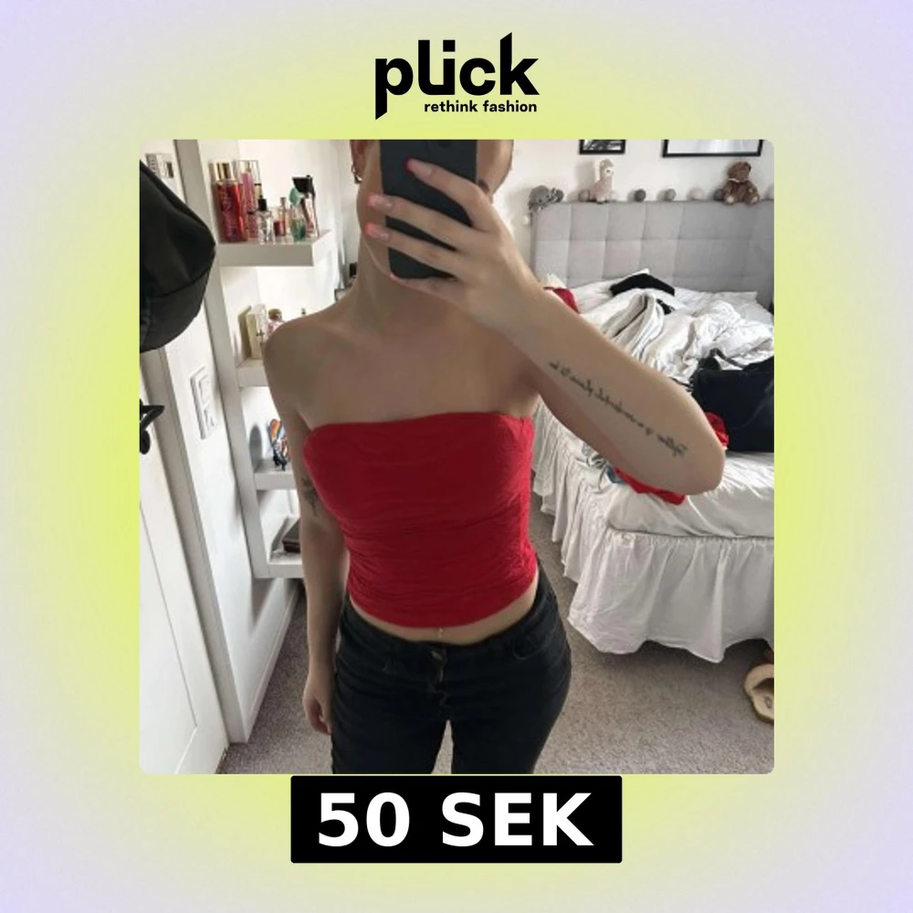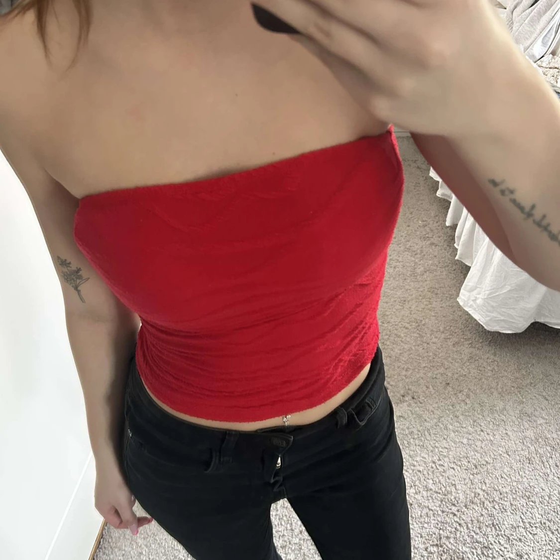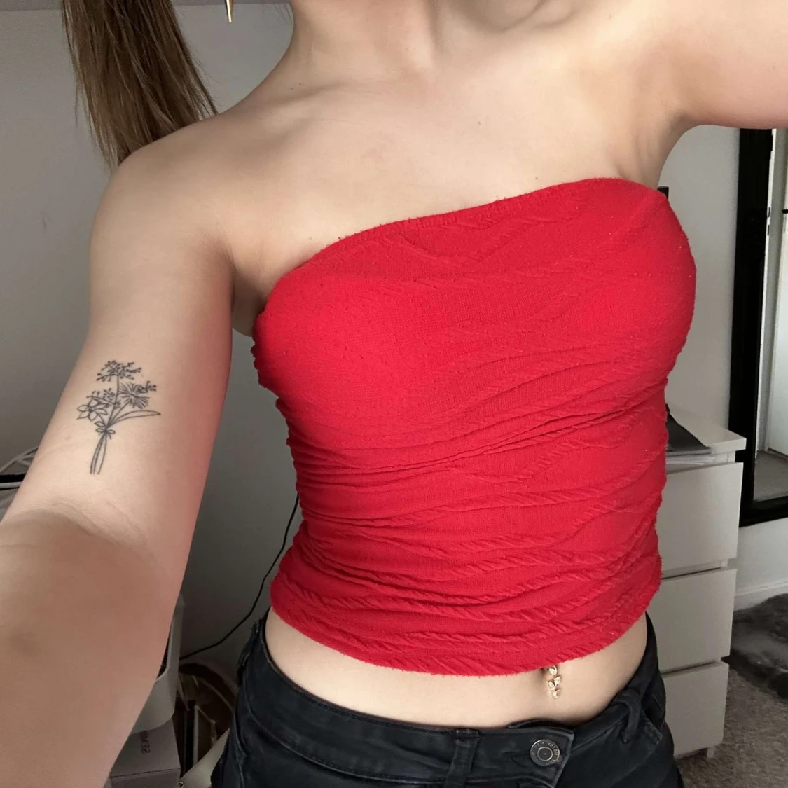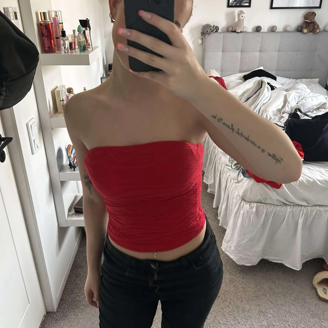 röd tubtopp med lätt rynkad effekt. Toppen är axelbandslös och sitter tight mot kroppen. Perfekt för dig som vill ha en enkel men snygg topp till sommaren. Superfint skick!