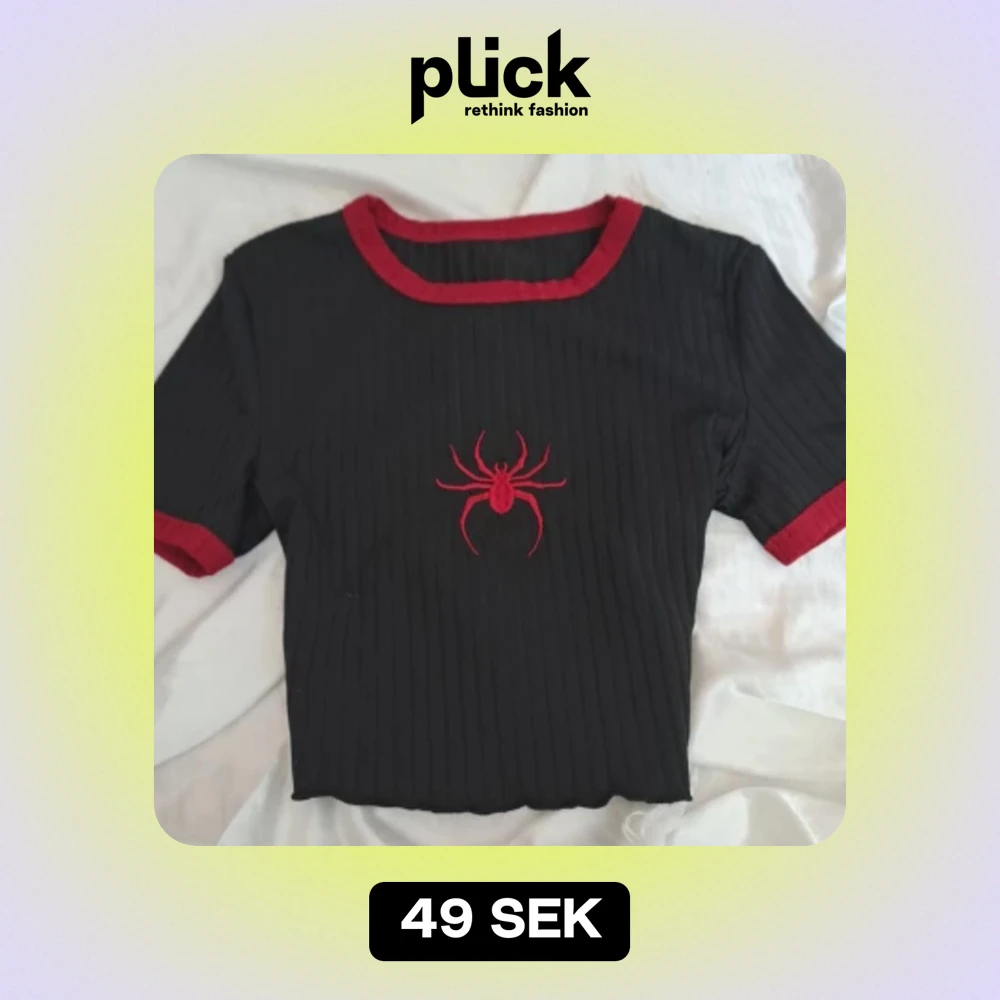 Säljer en cool svart ribbad topp från Shein med en röd spindel broderad på framsidan. Toppen har korta ärmar och röda detaljer vid halsringning och ärmslut. Perfekt för en edgy look!