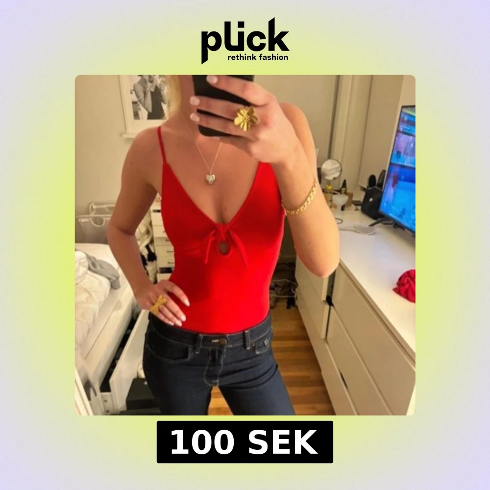 Säljer en röd body med smala axelband och snygg knytning framtill. Bodyn har en liten cut-out under knytet som ger en extra detalj. Perfekt för dig som gillar att sticka ut med färg och enkel design.