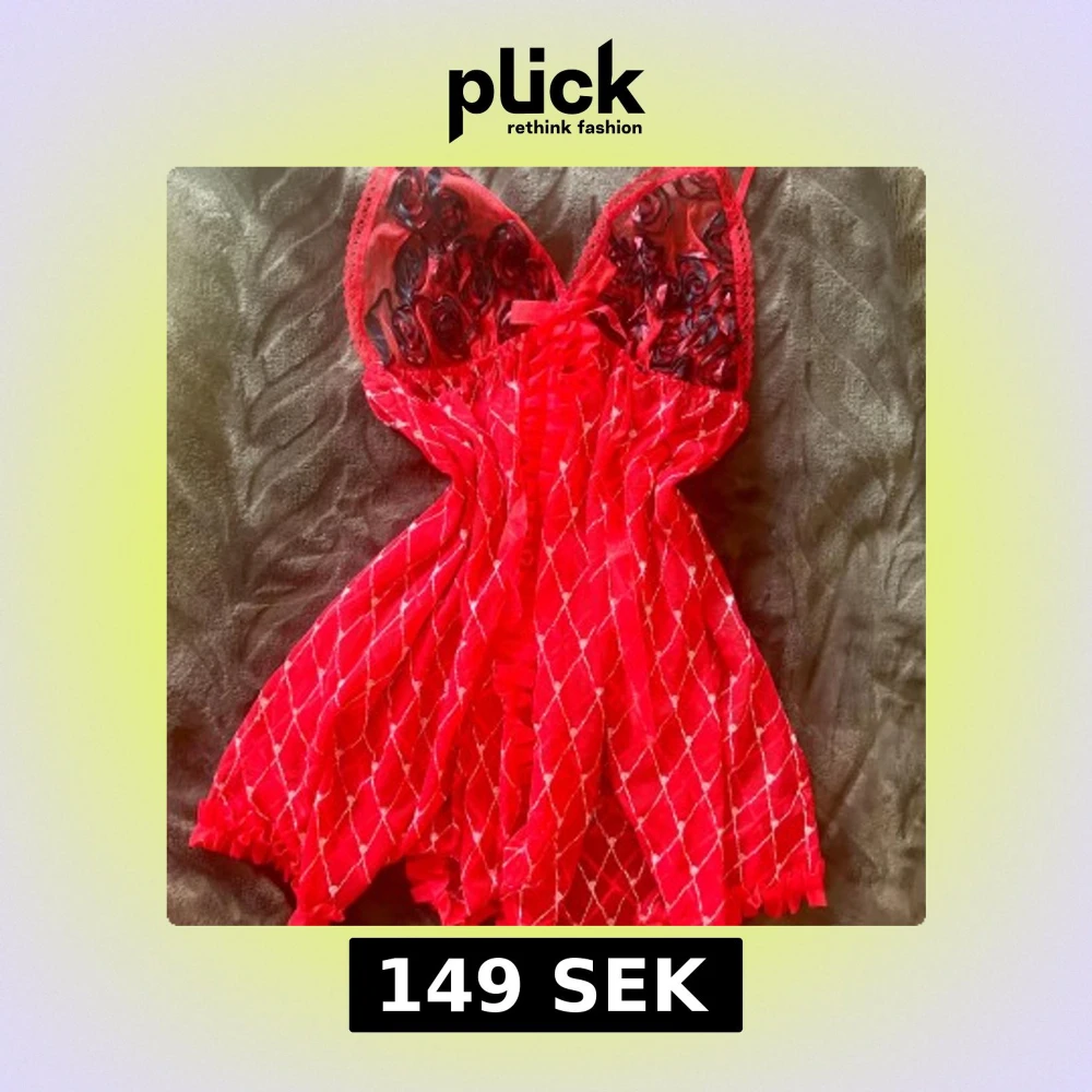 Säljer en röd kortklänning med transparent mesh och vita rutmönster. Överdelen har svarta och röda broderade rosor, spetskant och en söt rosett framtill. Volangdetaljer längs mitten och nederkant ger extra flärd. Perfekt för dig som gillar unika detaljer.öppen i mitten men man kan fästa säkerhetsnål för att stänga
