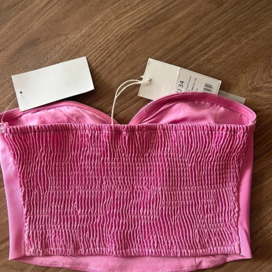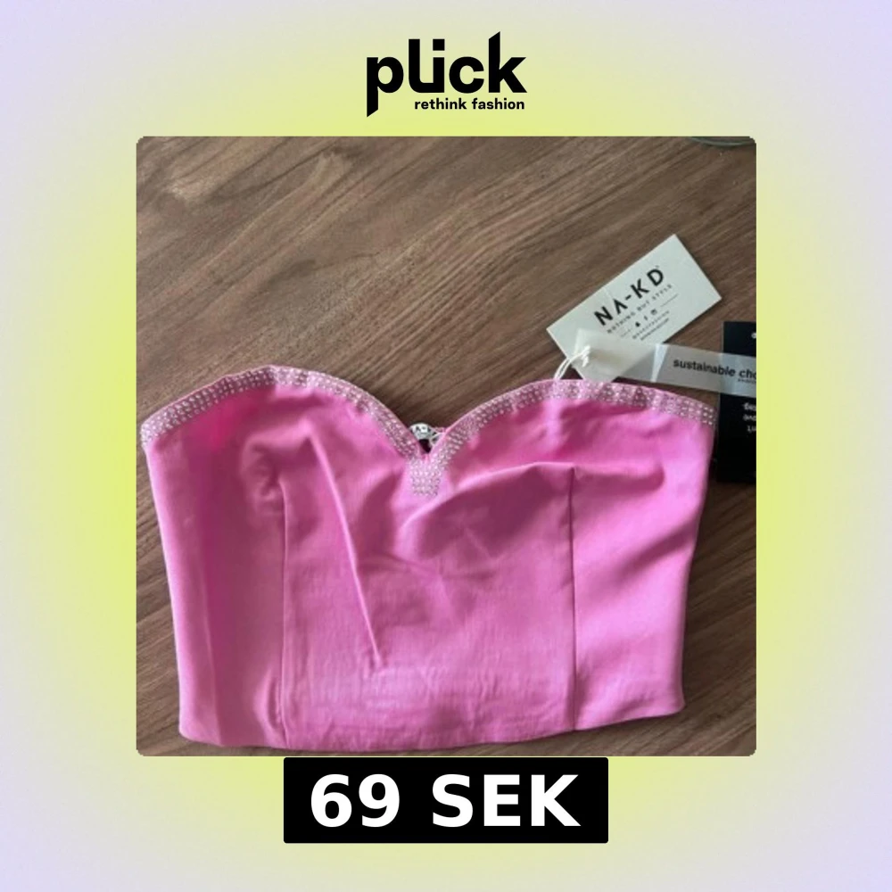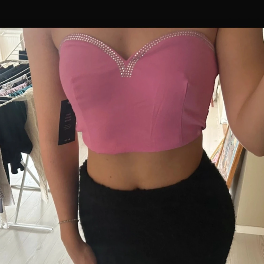 Säljer en rosa bandeau tubtopp från NA-KD med glittrande strassdetaljer längs den hjärtformade urringningen. Toppen är croppad och har smockad baksida för extra komfort. Perfekt för dig som vill sticka ut med en färgglad och trendig look.