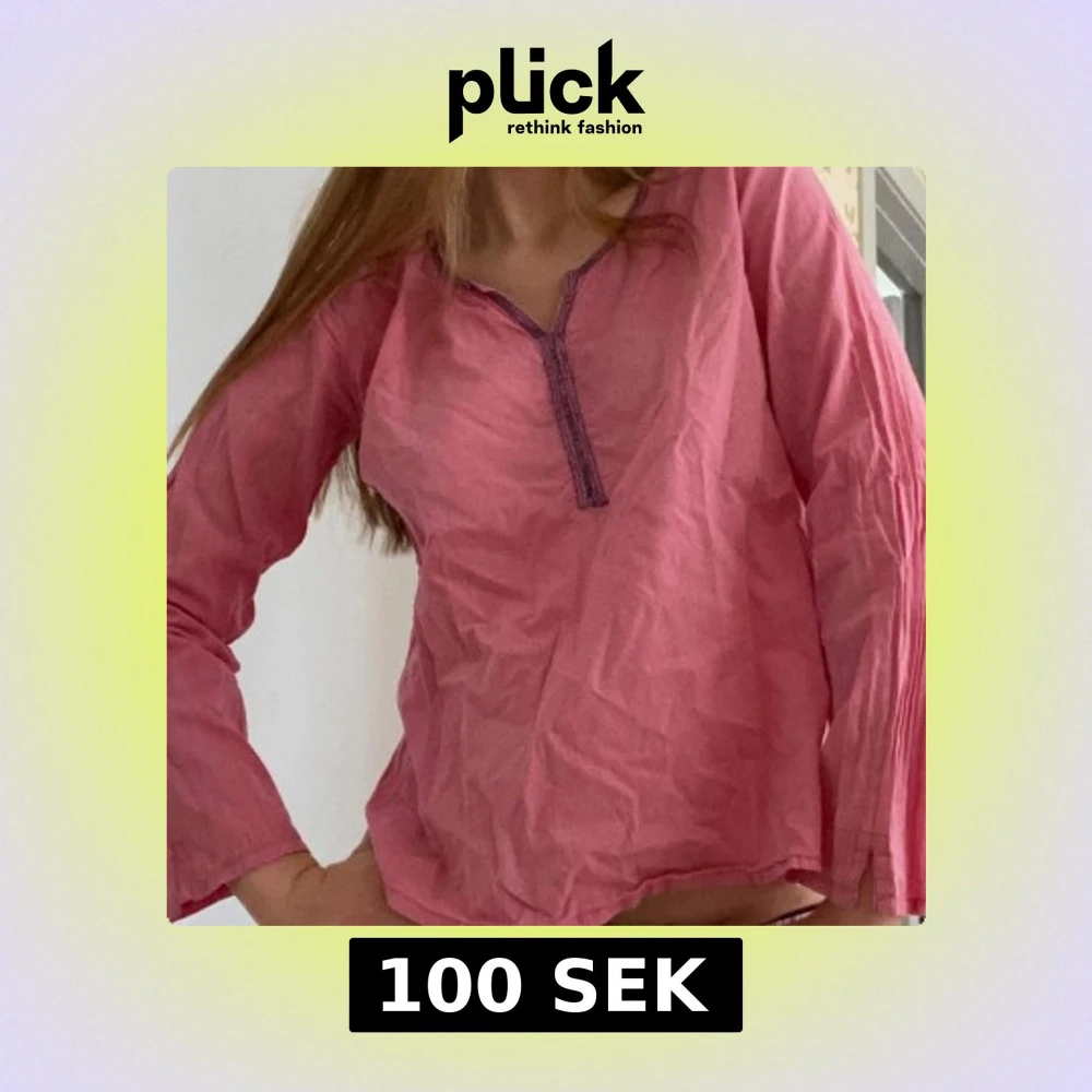 Säljer en söt rosa blus från Brittinger i storlek S. Blusen har långa ärmar och en v-ringad hals med dekorativa sömmar. Perfekt för en avslappnad stil.