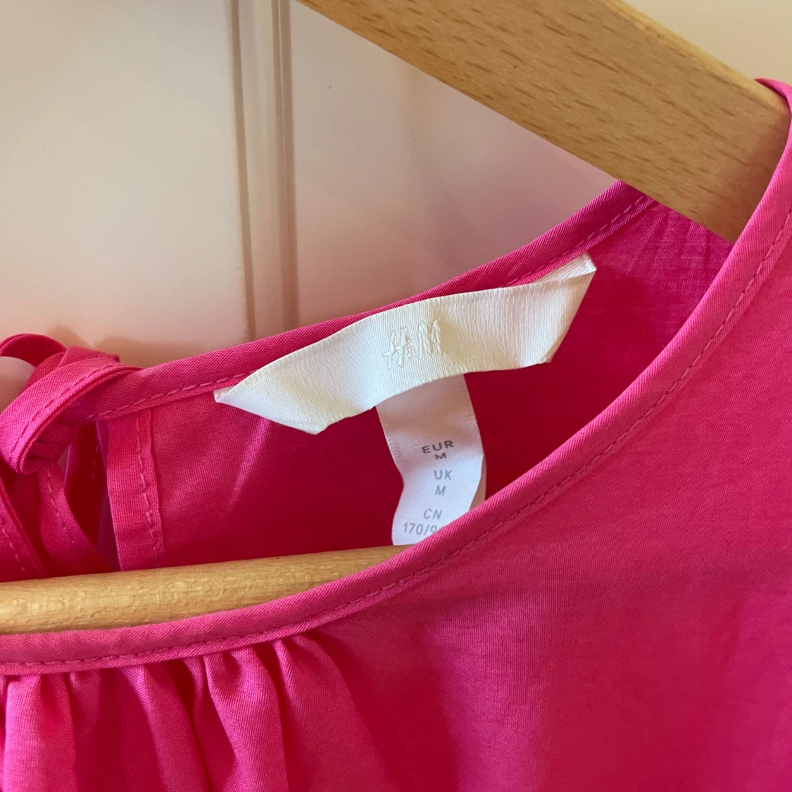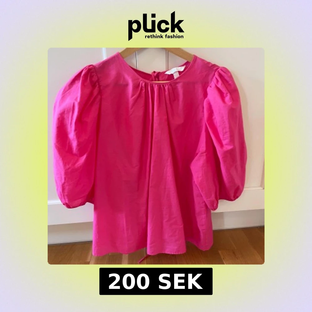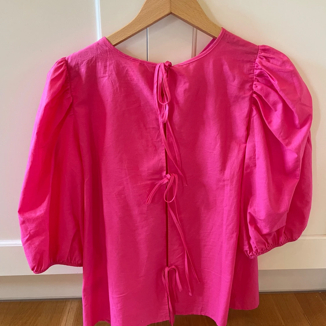 Superfin rosa blus från H&M med puffiga trekvartsärmar och snygga knytband i ryggen. Blusen har en lös passform och är gjord i mjuk bomull, perfekt för dig som gillar färg och volym i din outfit.