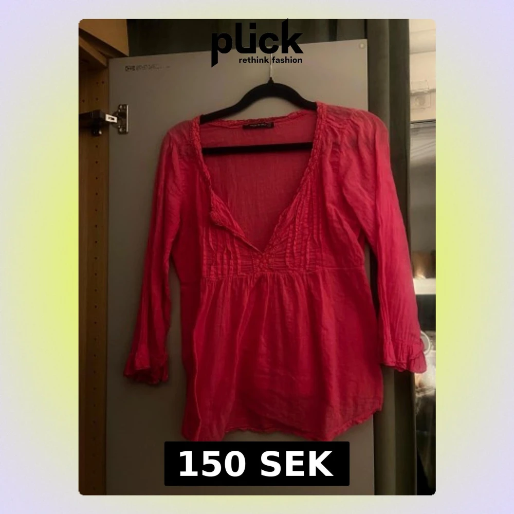 Säljer en snygg rosa blus med djup v-ringning och veckade detaljer framtill.
