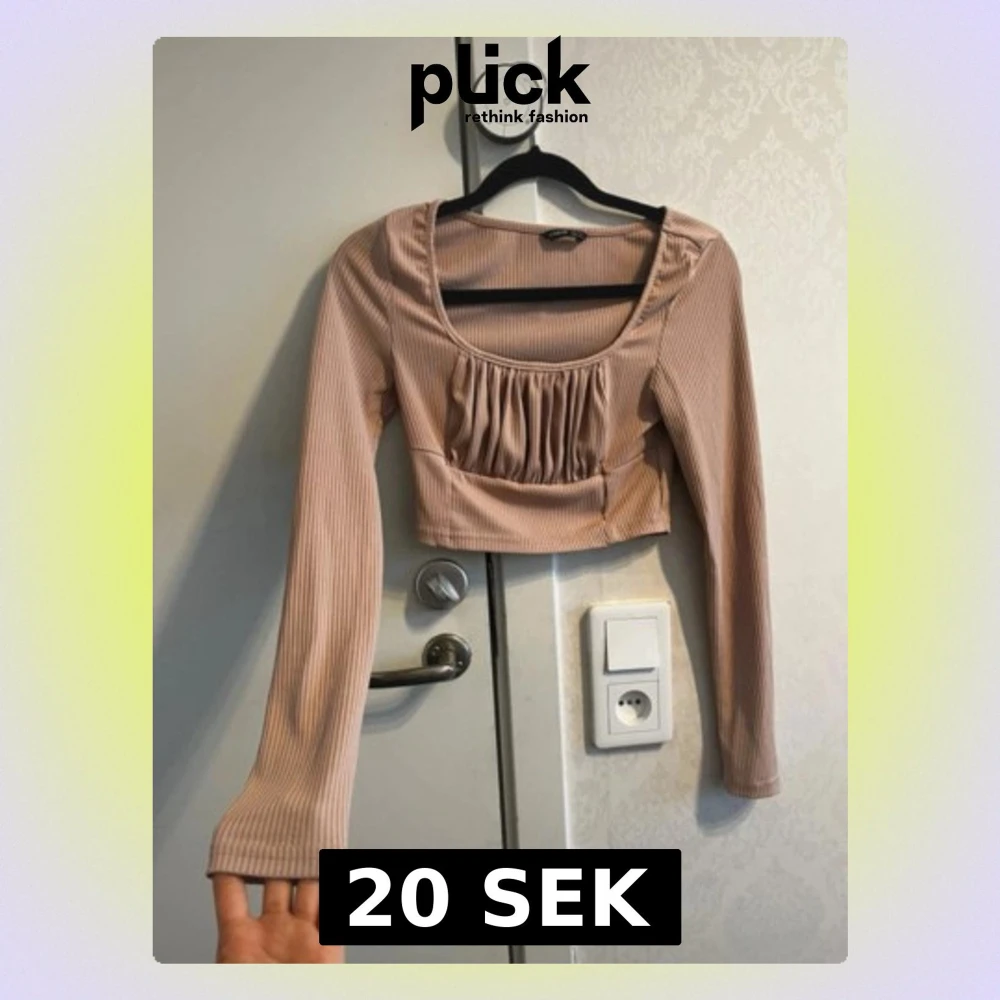 En söt, babyrosa långärmad crop-tshirt i storlek S från SHEIN. Ribbad struktur och rynkade detaljer framtill. Långärmad modell med bred, rundad urringning.