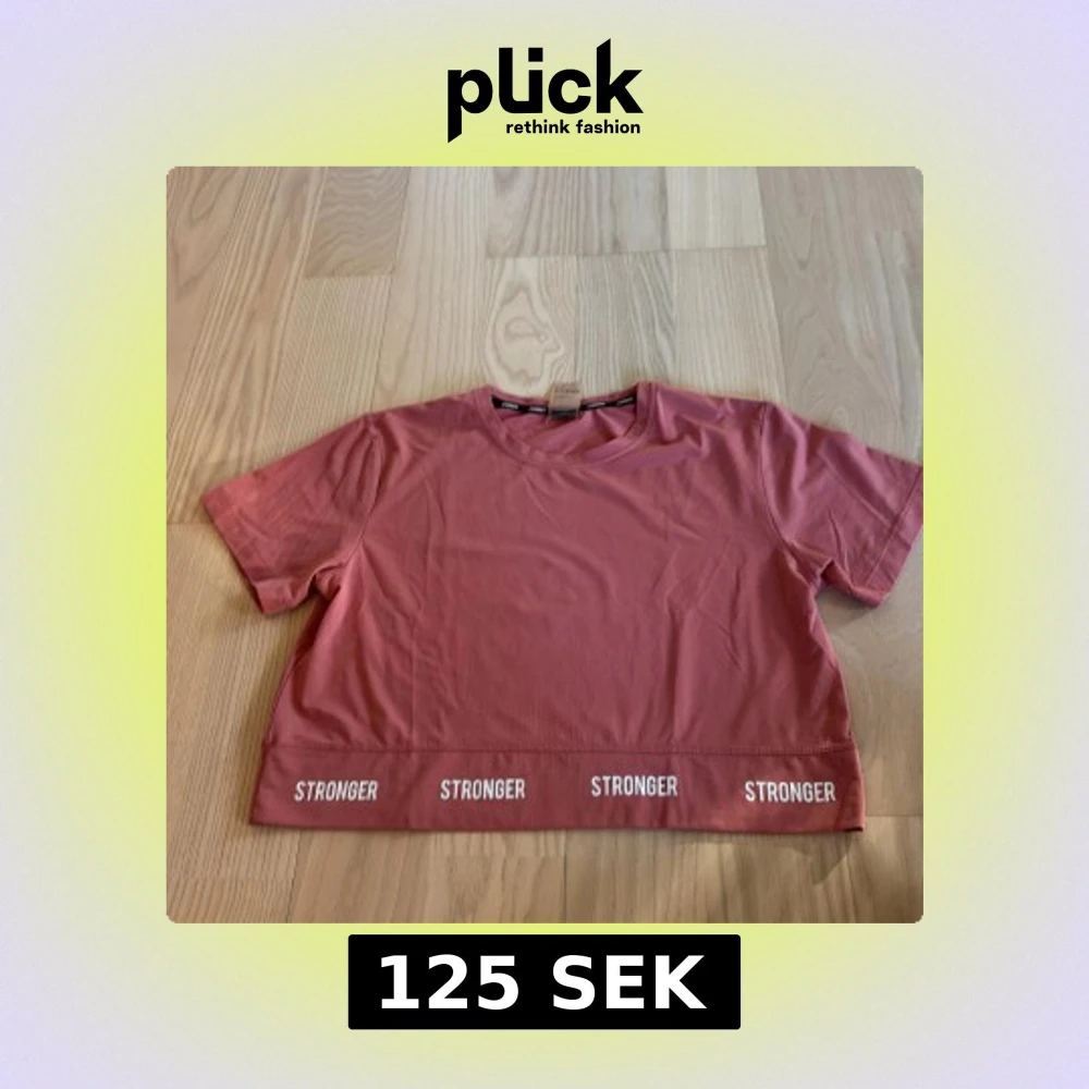 Croppad rosa topp från Stronger med kort ärm och rund hals. Nedtill finns vit text med loggan 'STRONGER' tryckt flera gånger. perfekt för träning