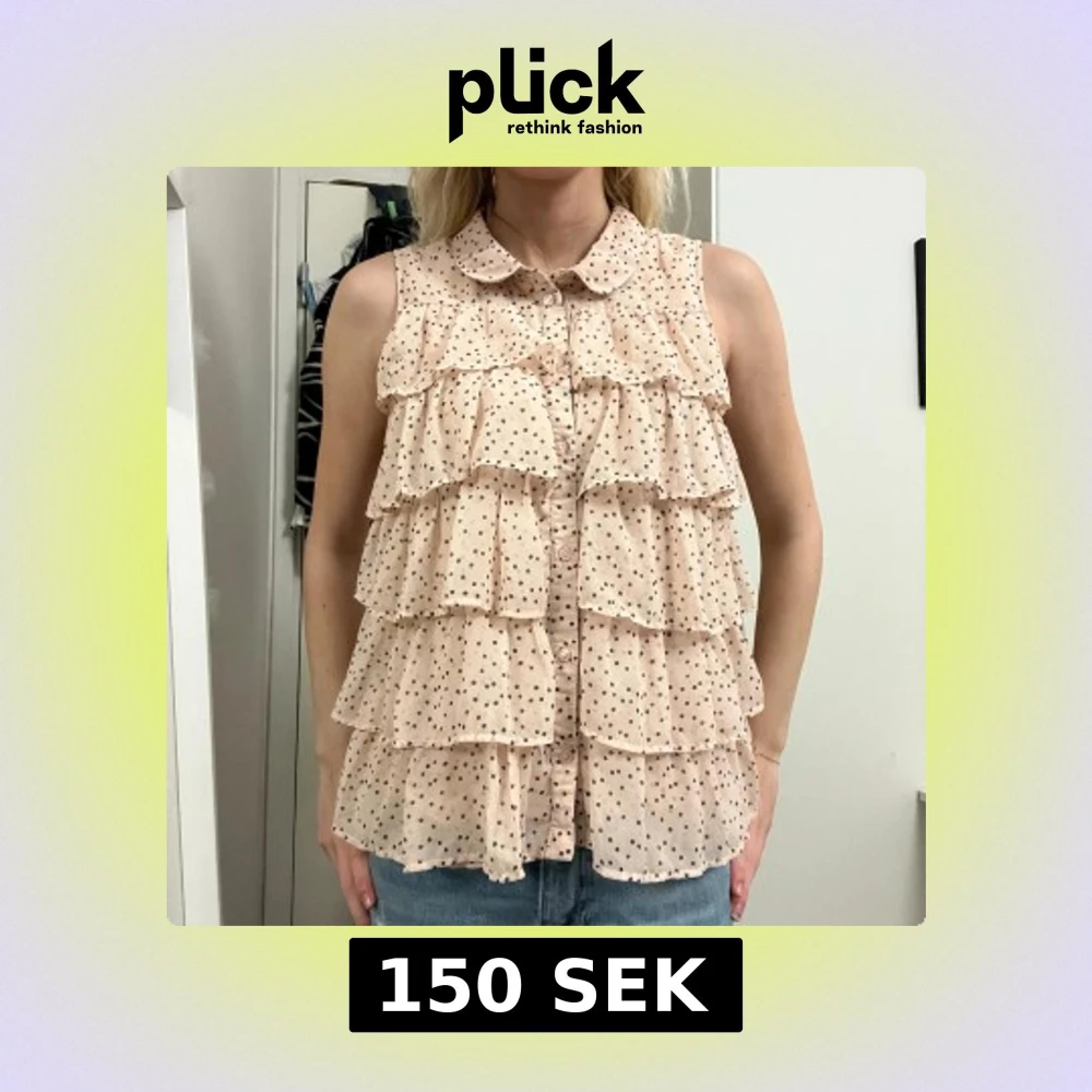 Säljer en söt blus i ljusrosa med svarta prickar och flera lager volanger framtill. Blusen är ärmlös, har en rund krage och knäppning hela vägen fram. Materialet är lätt och luftigt, perfekt för varmare dagar. Superfin till jeans eller kjol! Märket är Lindex och storlek S (170).