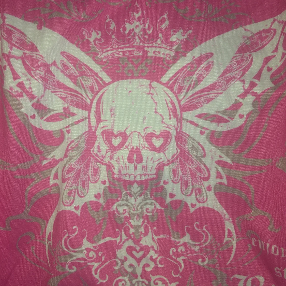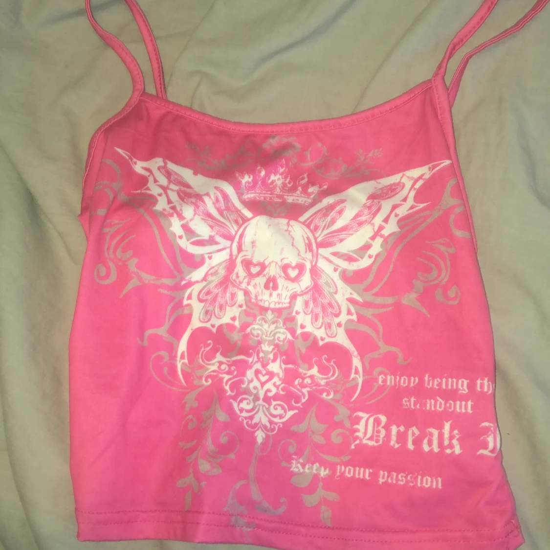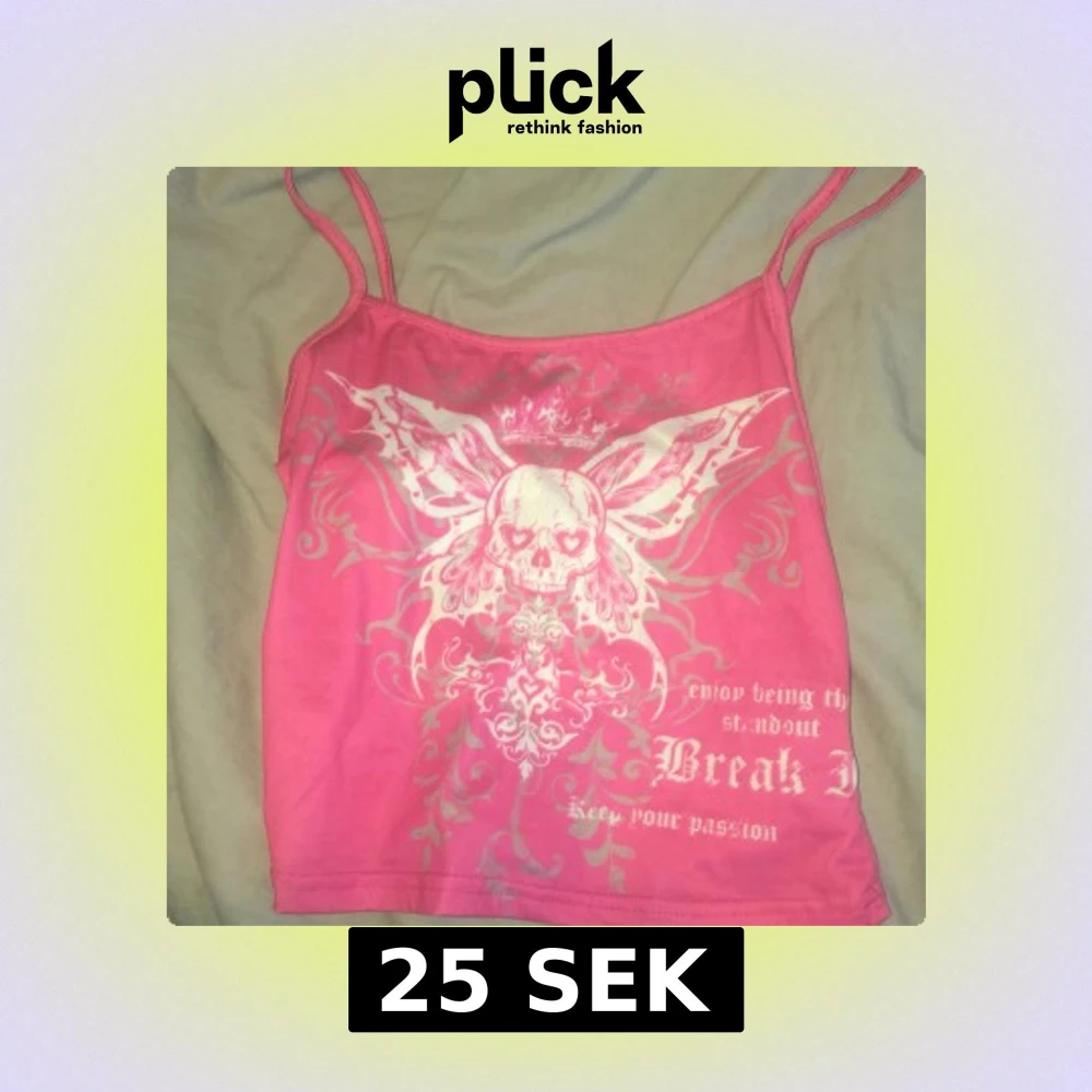 Säljer ett rosa linne från SHEIN i storlek XS med smala axelband och ett stort tryck framtill med dödskalle, vingar och text. Toppen har en edgy vibe och är gjord i stretchig polyesterblandning. Perfekt för dig som gillar statement-plagg och coola detaljer./ ai skrev ❤️🙏