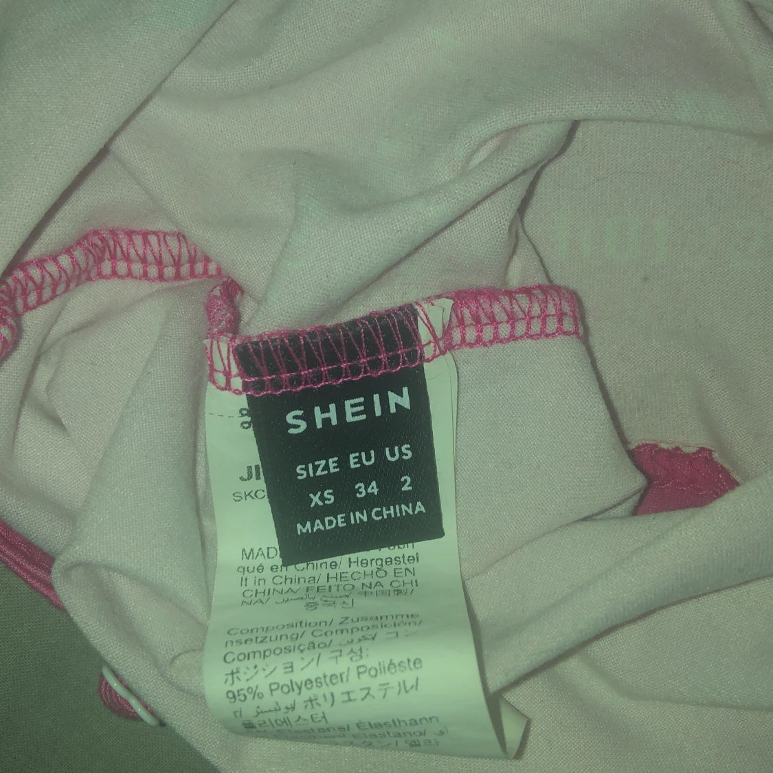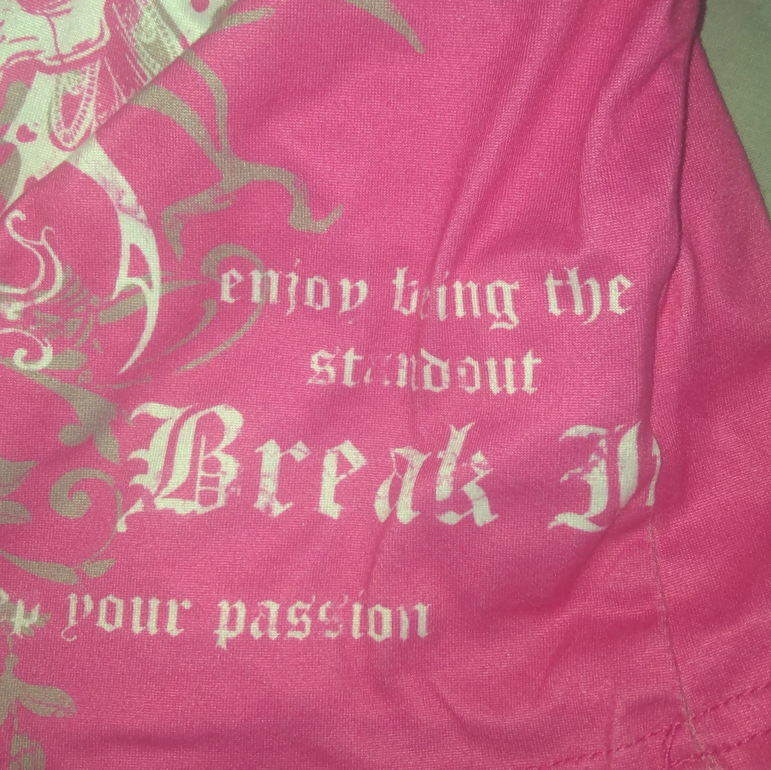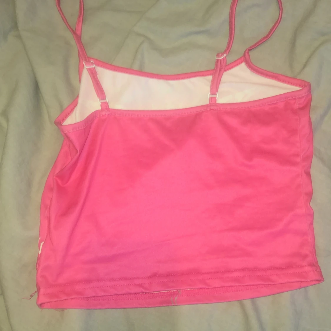 Säljer ett rosa linne från SHEIN i storlek XS med smala axelband och ett stort tryck framtill med dödskalle, vingar och text. Toppen har en edgy vibe och är gjord i stretchig polyesterblandning. Perfekt för dig som gillar statement-plagg och coola detaljer./ ai skrev ❤️🙏