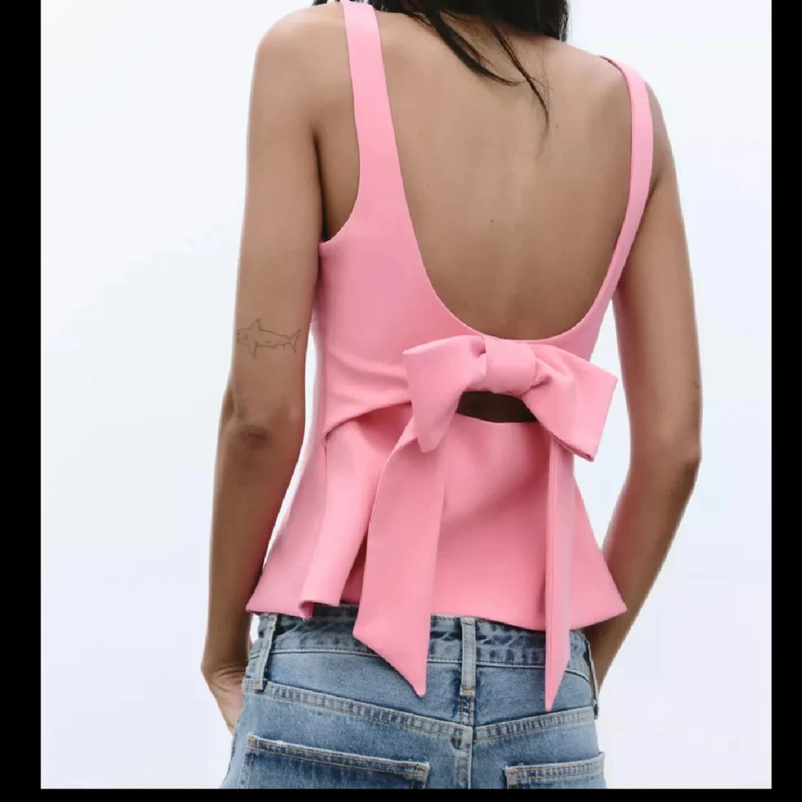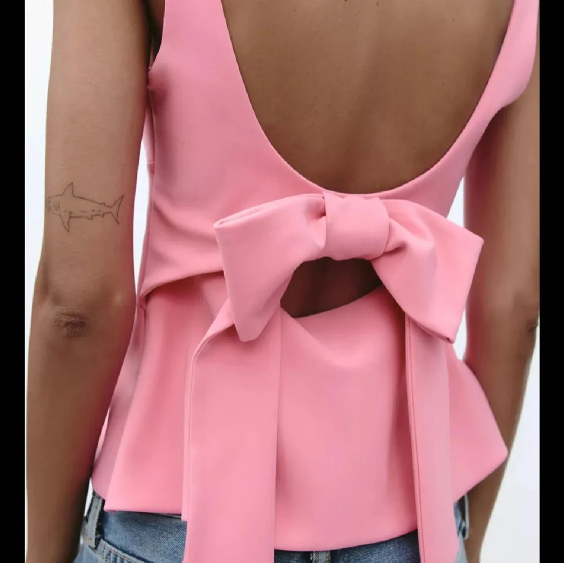 Supersöt rosa linnetopp med fyrkantig ringning och breda axelband. Toppen har en öppen rygg med en stor dekorativ rosett och lätt utsvängd nederkant. Perfekt för dig som vill sticka ut med en feminin och trendig look.