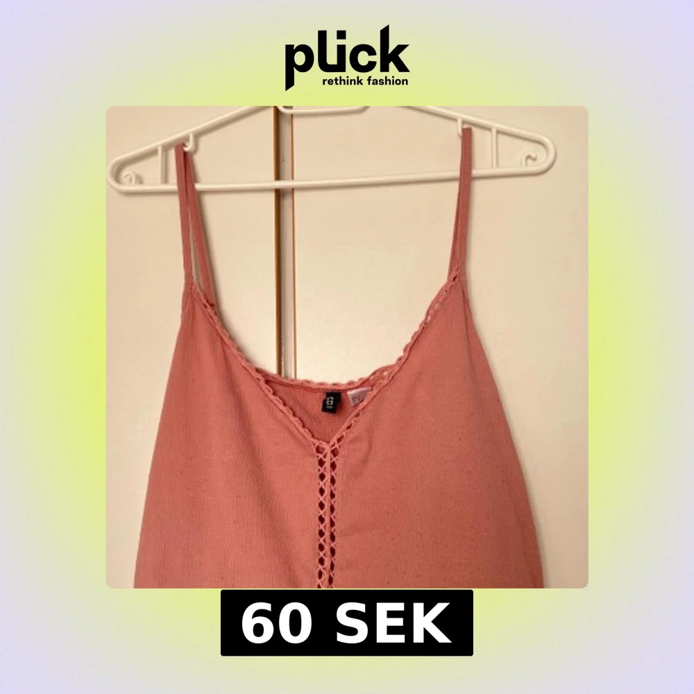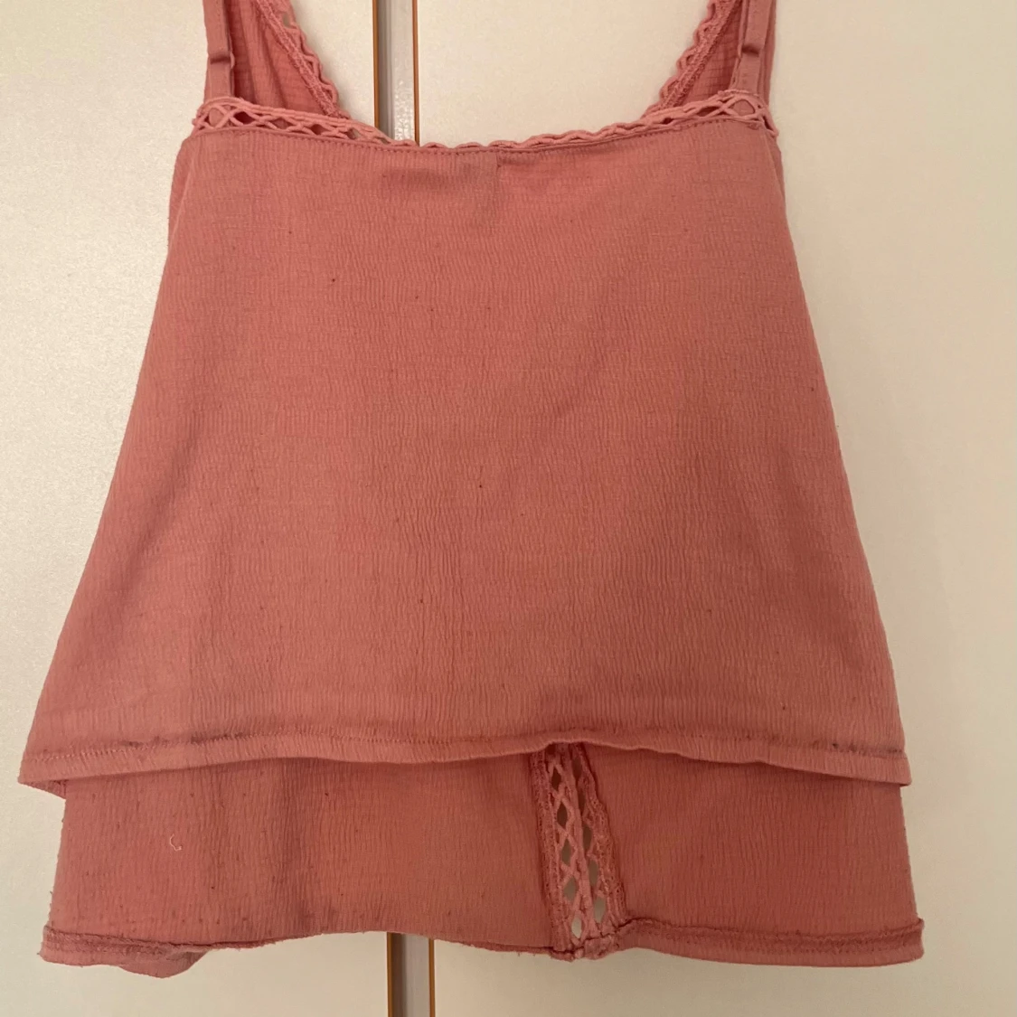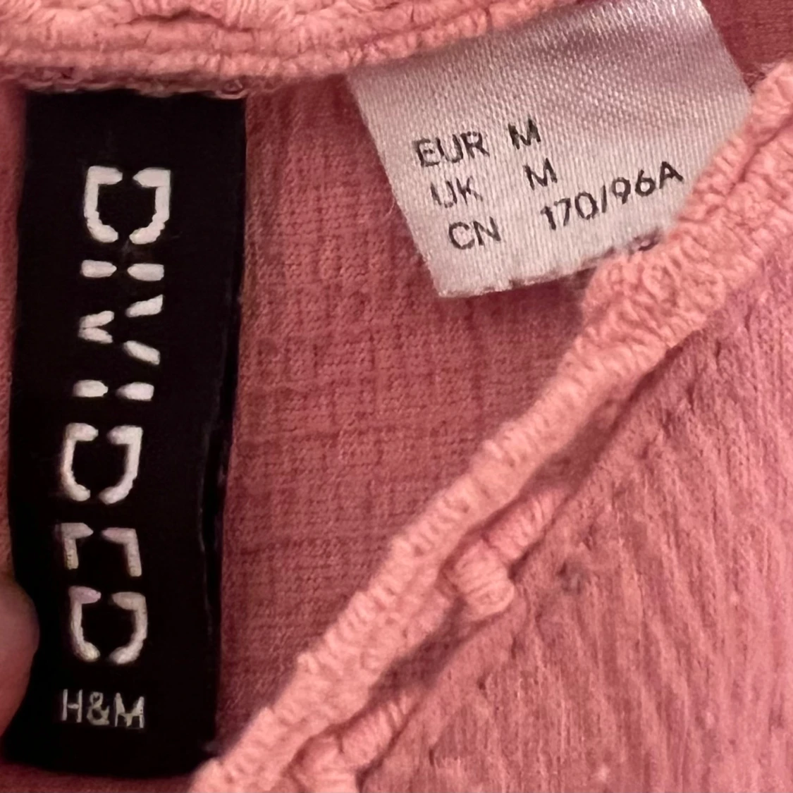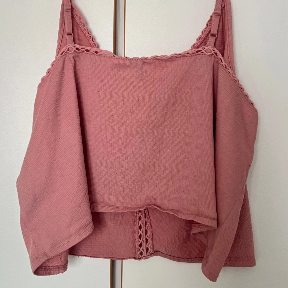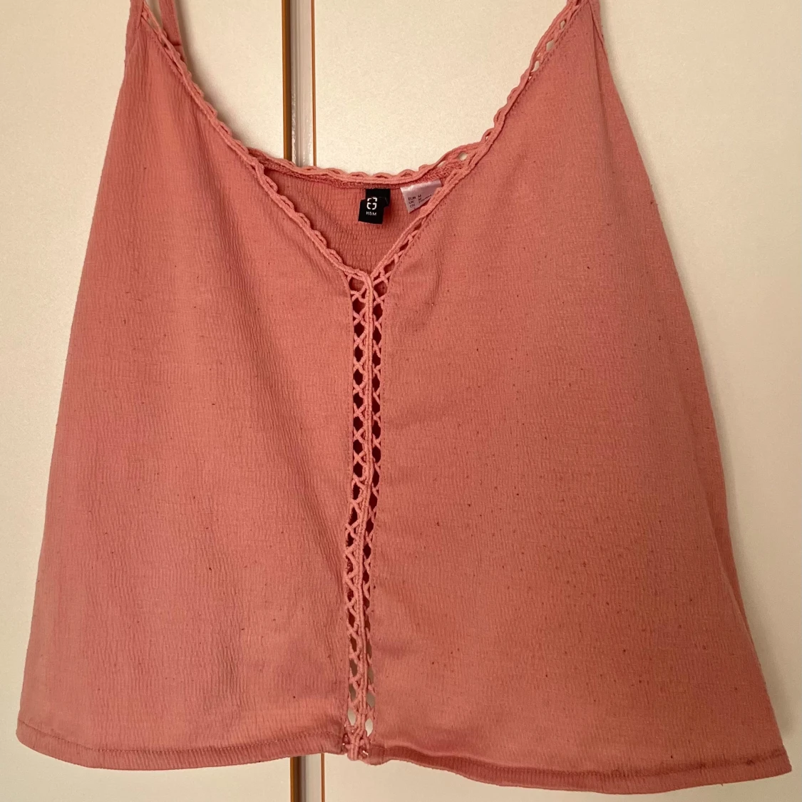 Supersöt rosa linnetopp från H&M med tunna axelband och dekorativ spetskant längs ringningen och framtill. Toppen har en lätt A-linjeform och är tillverkad i ett mjukt bomullstyg. Perfekt för varma dagar och enkel att styla med jeans eller kjol.