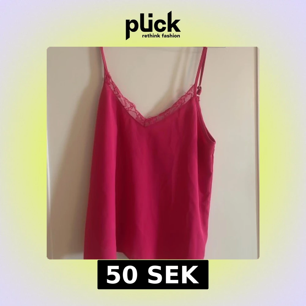 Säljer en snygg rosa linnetopp med tunna axelband och v-ringning dekorerad med spets. Toppen har en lös passform och är tillverkad i ett mjukt, lätt material som känns skönt mot huden.