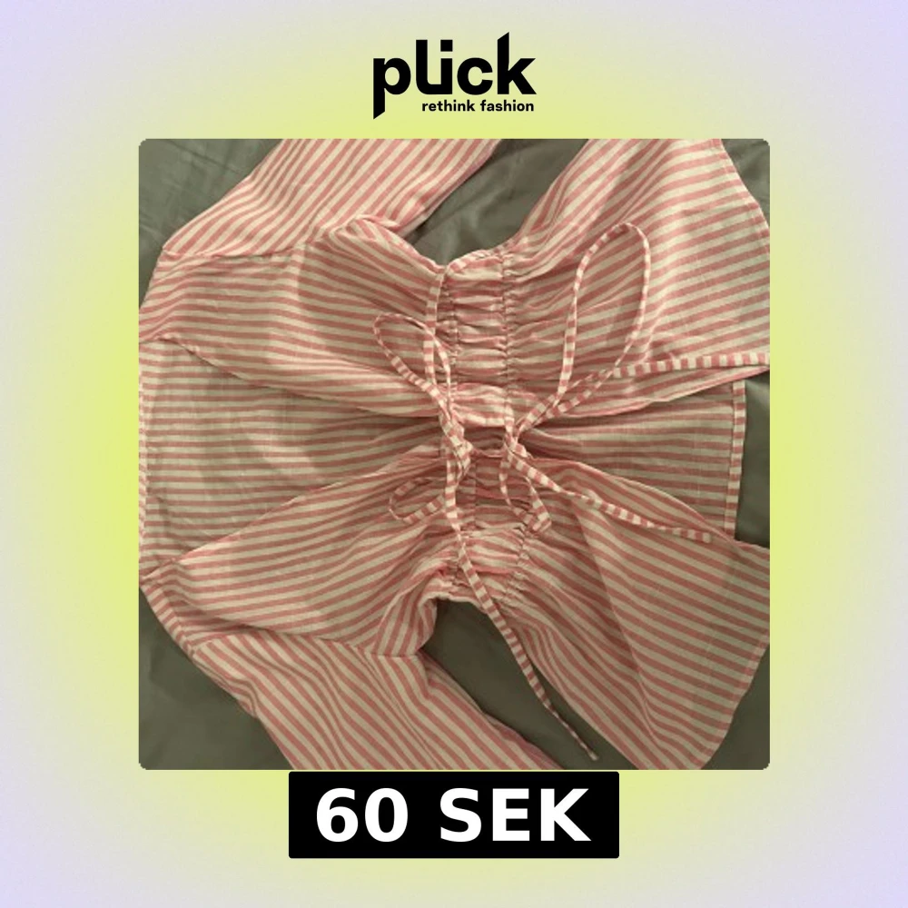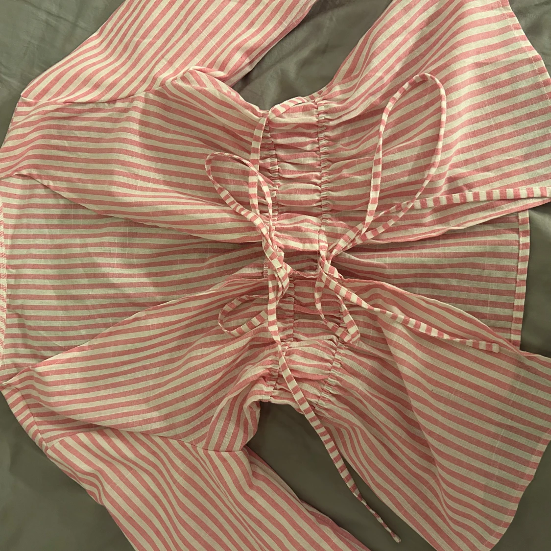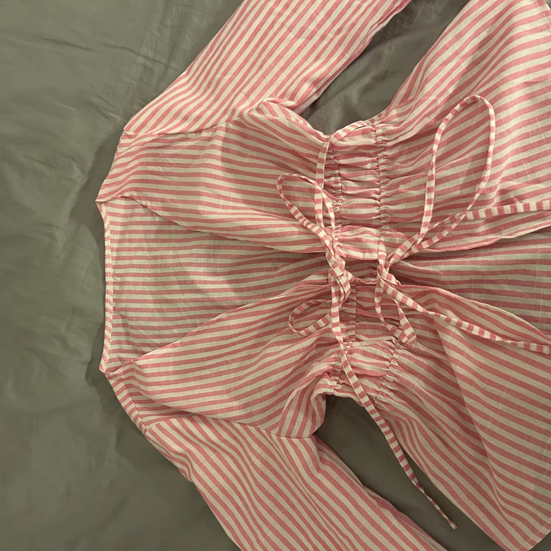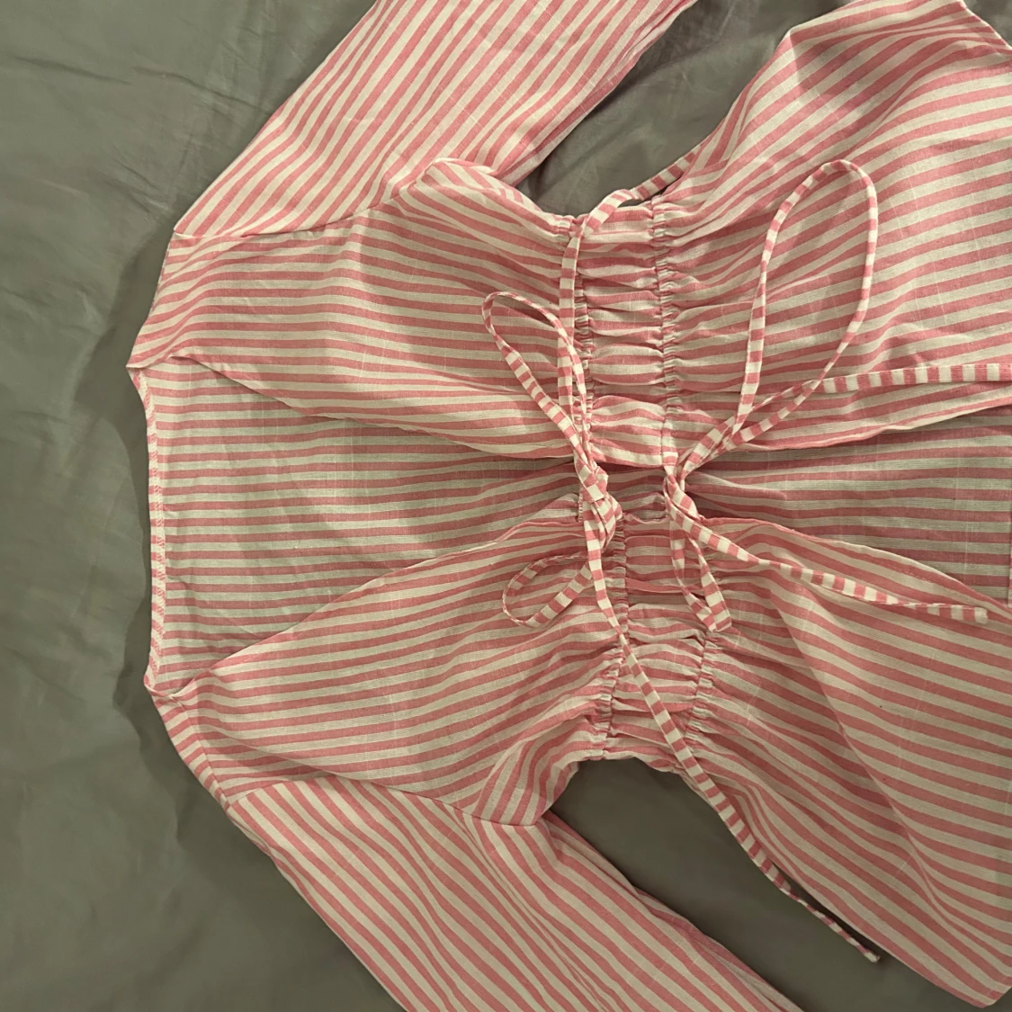 Säljer en söt blus med rosa och vita ränder. Toppen har långa ärmar och snygg snörning framtill som ger en unik look. Luftigt material, perfekt för varmare dagar. Passformen är normal och toppen har en lätt croppad känsla.