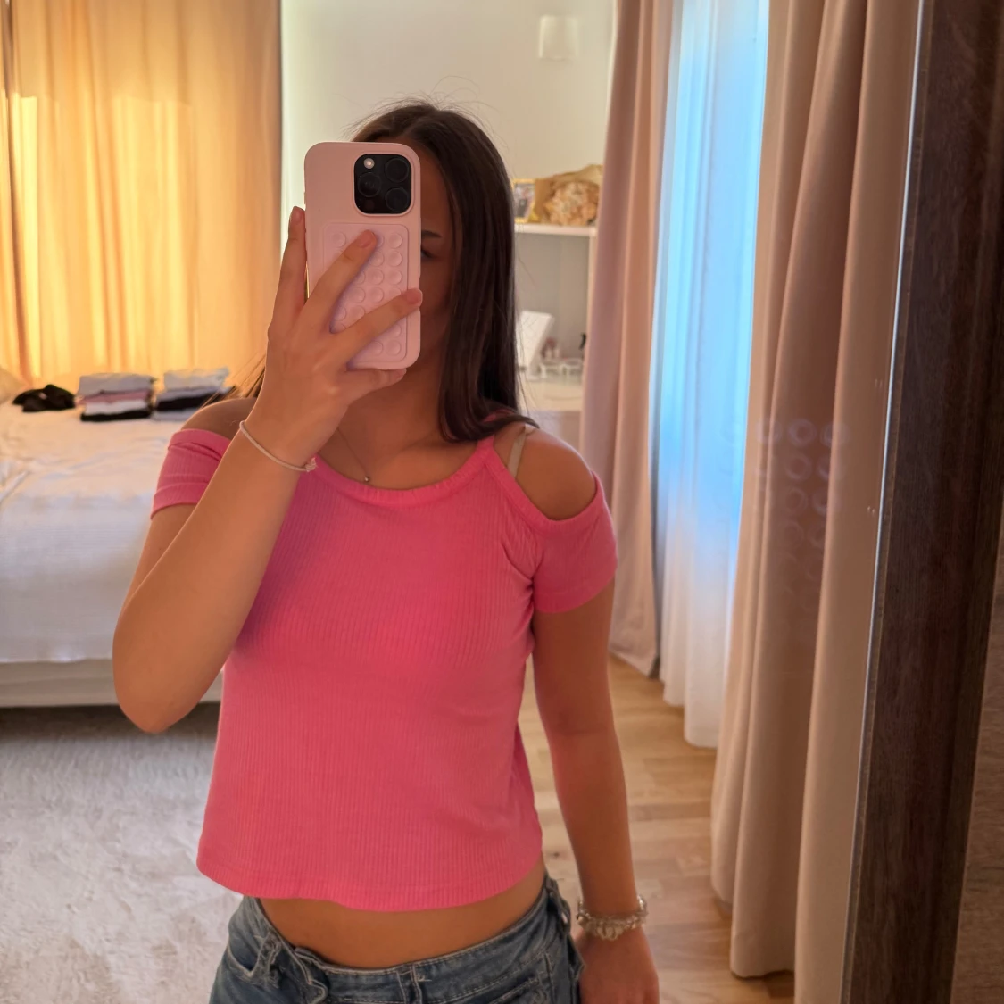 Säljer en ljusrosa croppad topp med offshoulder-design och korta ärmar. Toppen är ribbad och har en snygg, ungdomlig stil som passar perfekt till jeans eller kjol. Superfin färg och skön passform för dig som gillar trendiga plagg.
